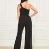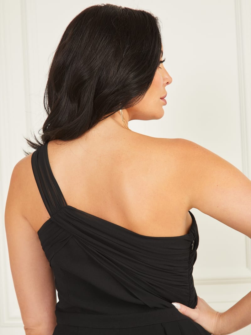 The spotlight is yours, so reach for this beautiful crepe jumpsuit featuring an asymmetrical neckline, a one-shoulder strap, wide leg and a gathered charmeuse top-layer that flows out into a side train. Hidden side zipper.