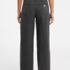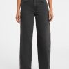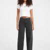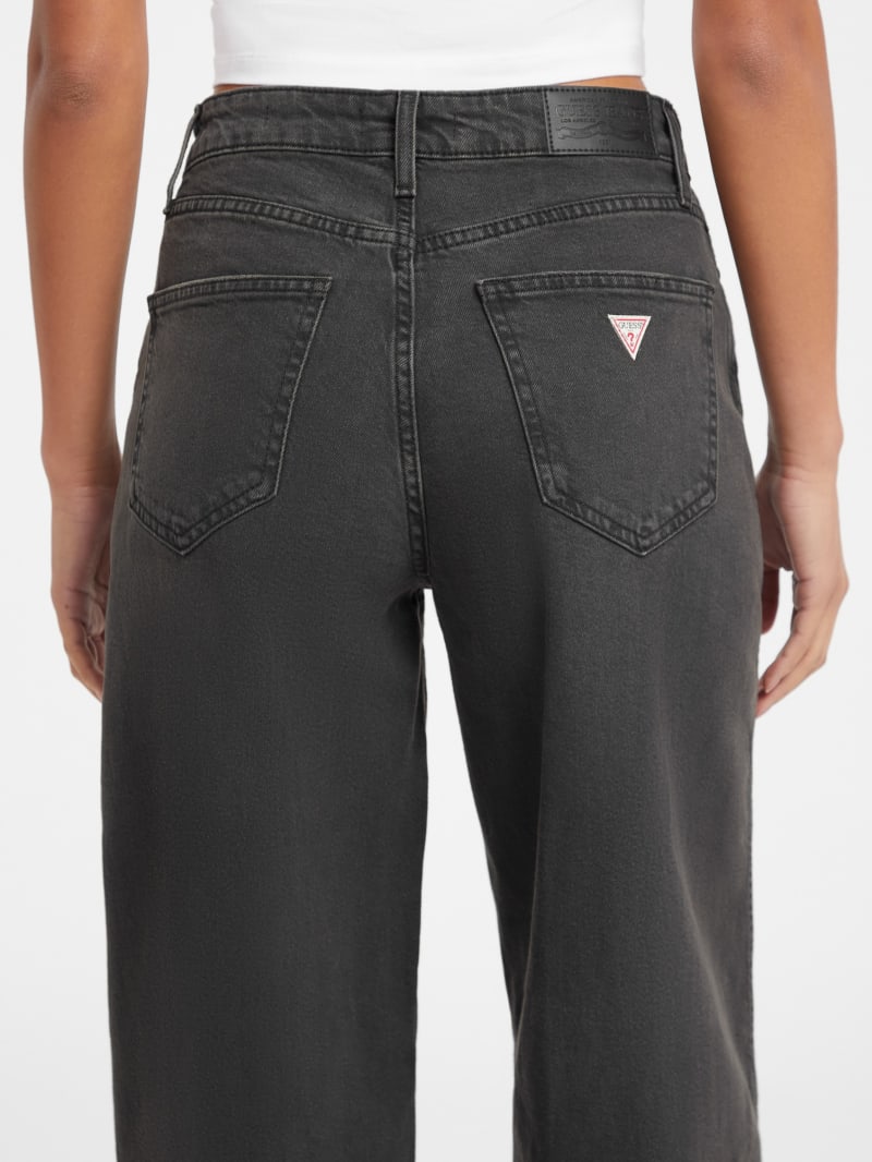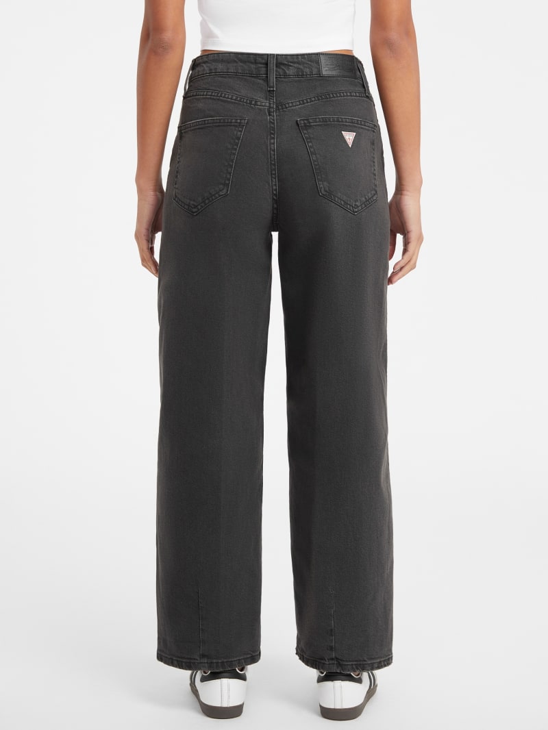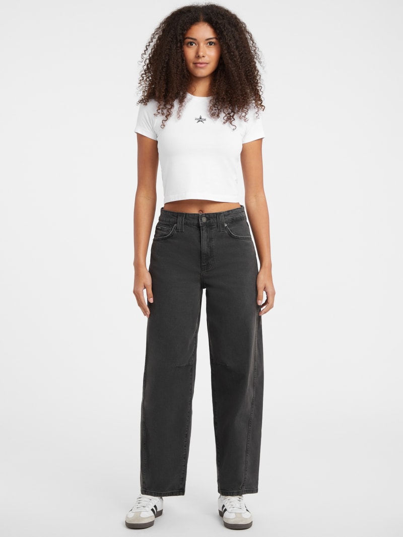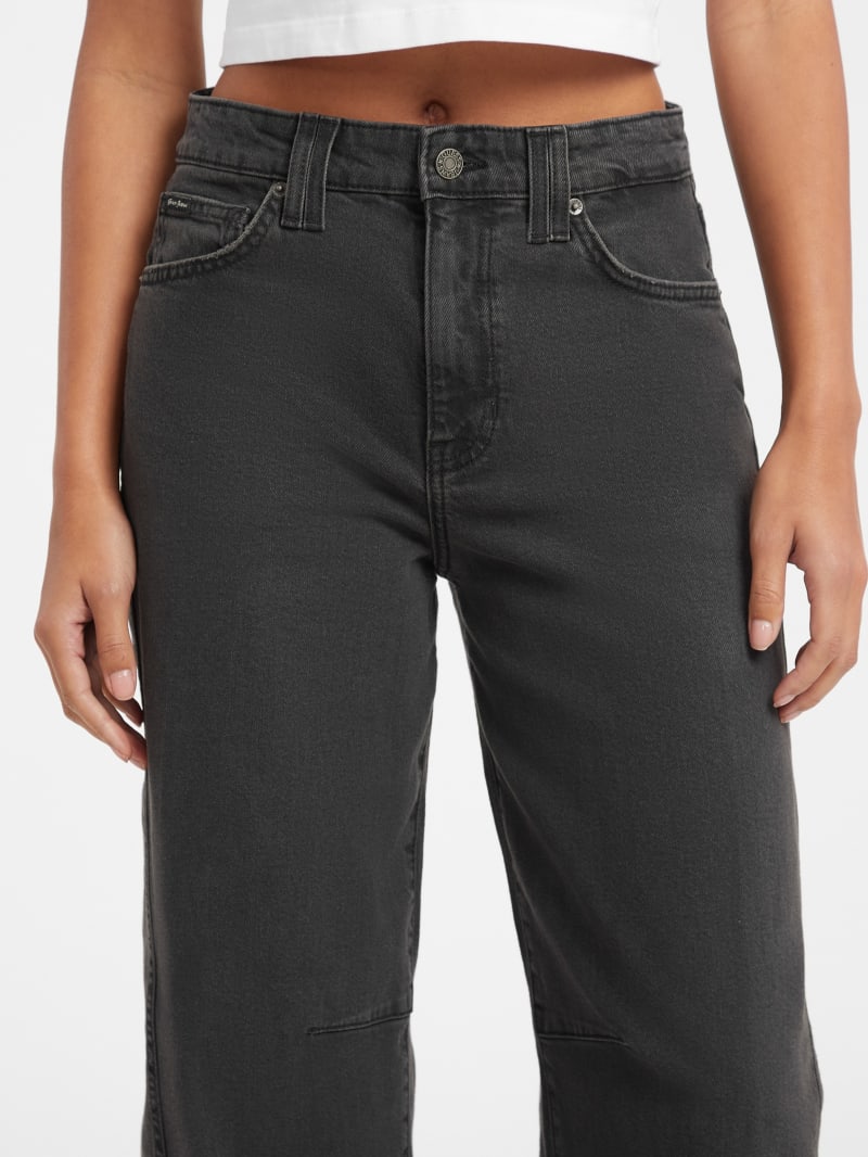 - Super high-rise, sits at natural waist. Relaxed fit and barrel leg.