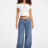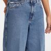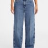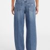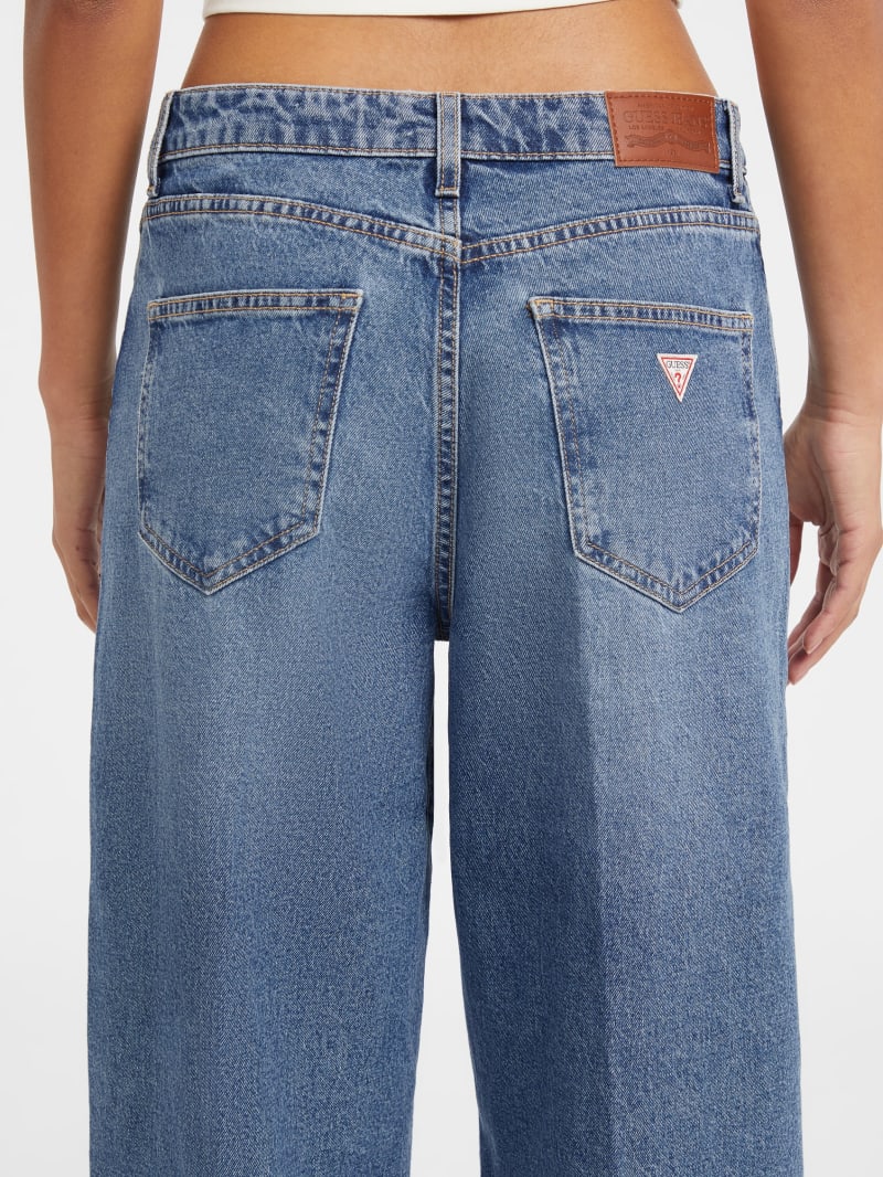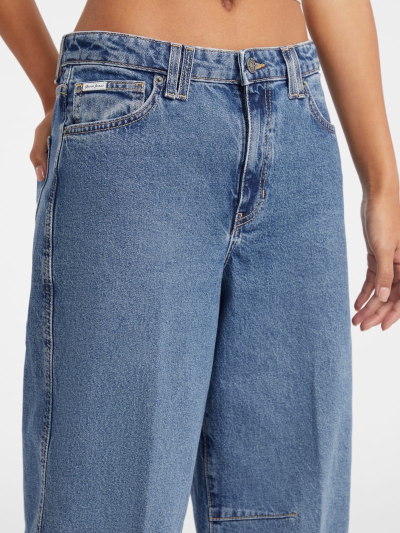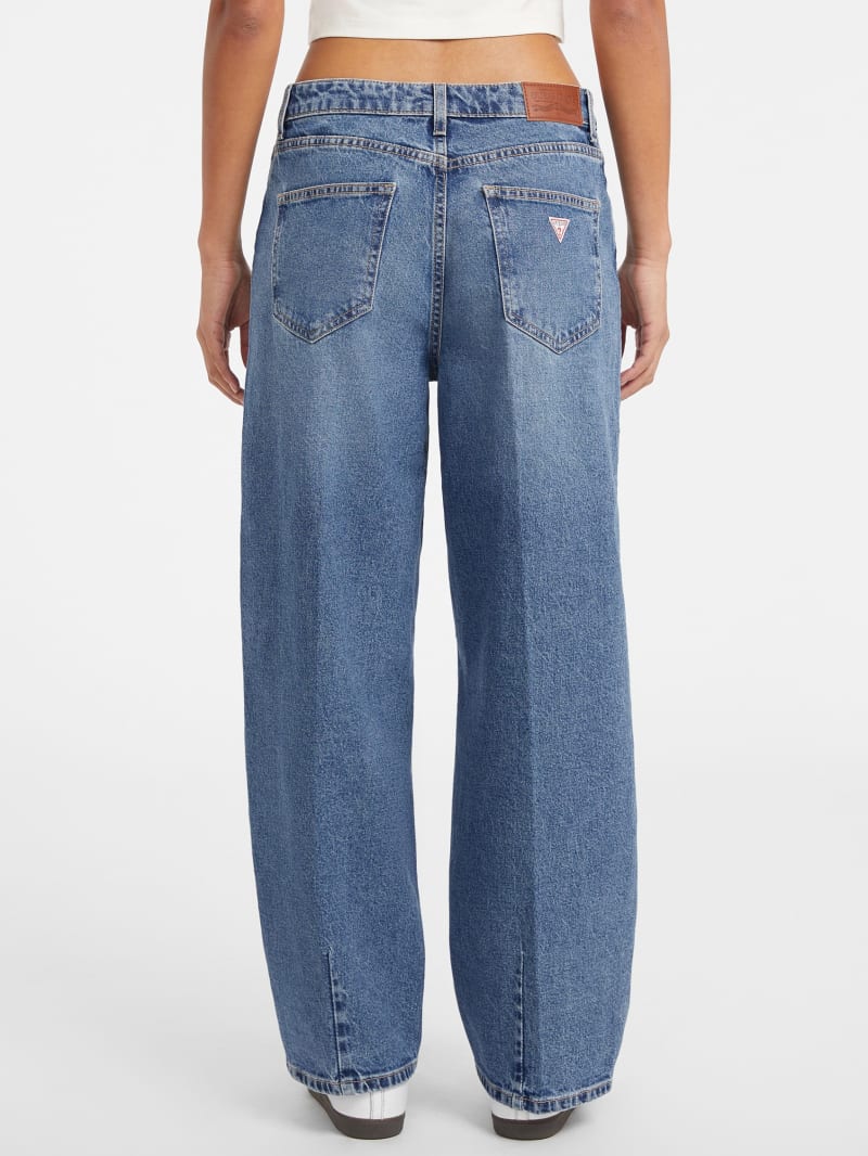 - Super high-rise, sits at natural waist. Relaxed fit and barrel leg.