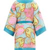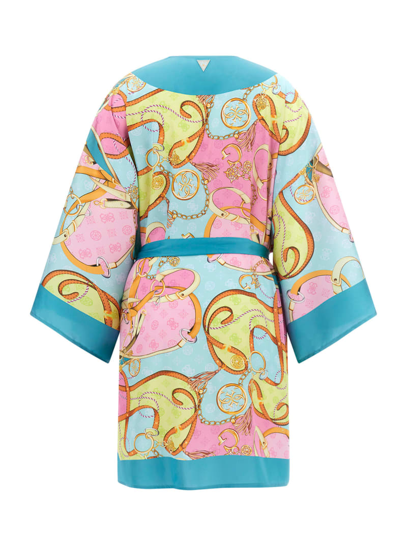 Luxe and effortless, this woven-satin kimono features a bold allover print, kimono-style sleeves, and a plunging neckline. Finished with contrast trim and a self-tie belt for a flattering fit.
