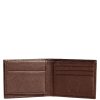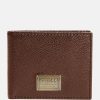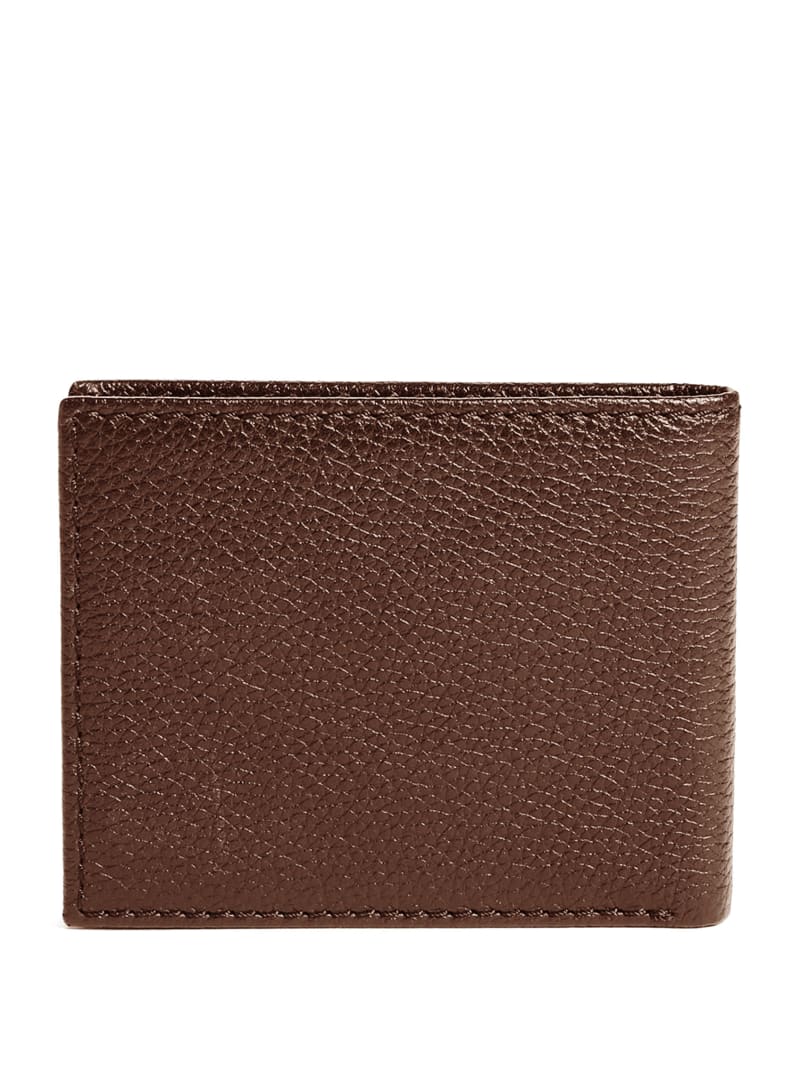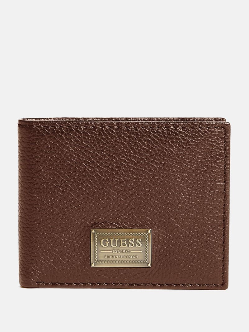 Faux-leather bifold wallet featuring a logo patch detail and interior flap with card slots for easy organization.