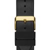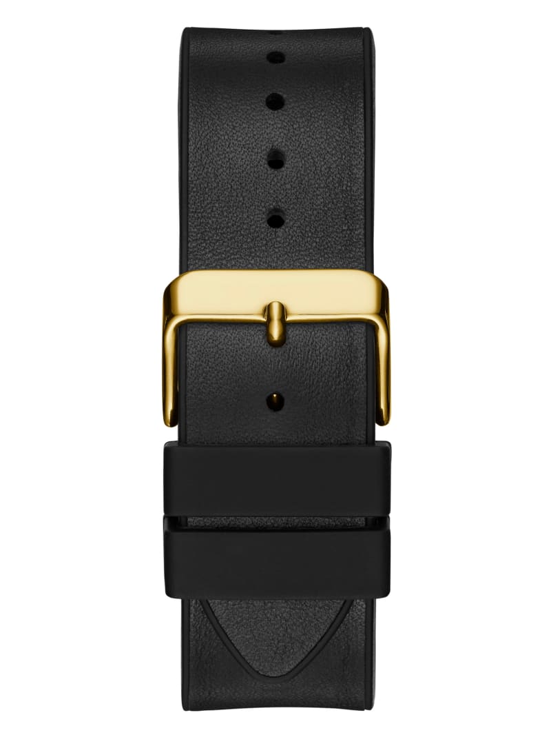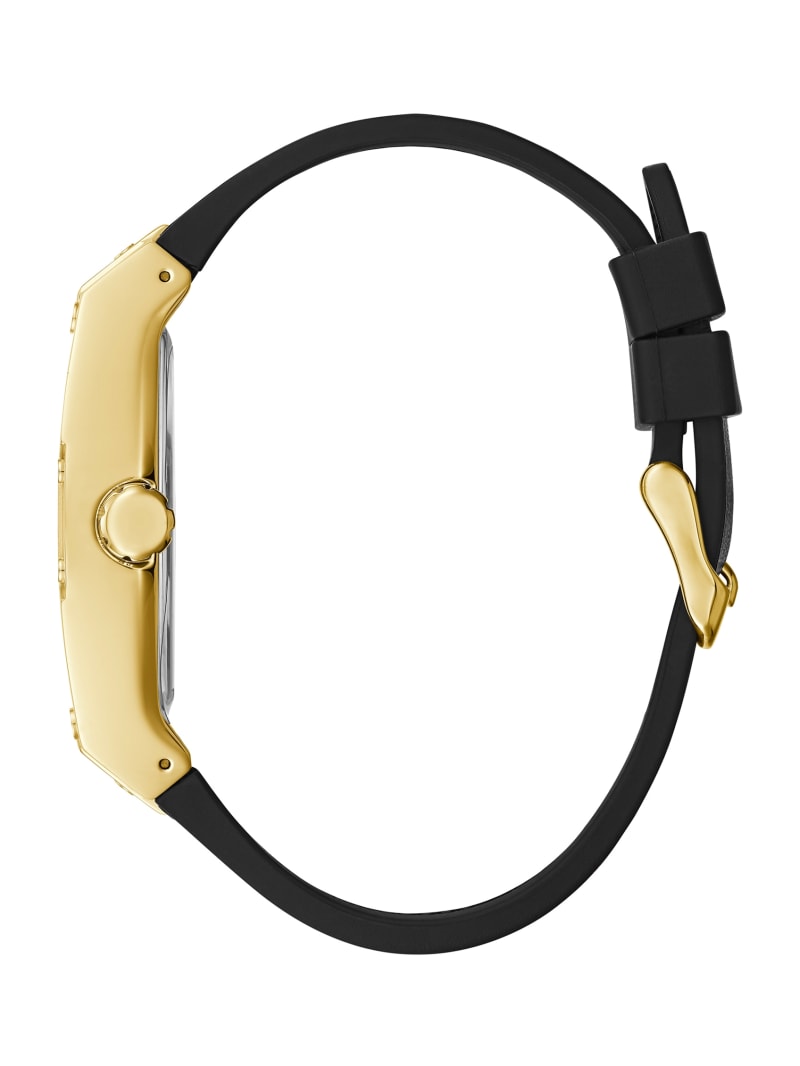 This watch is designed with a gold-tone barrel shaped case and a black multi-function dial. Made with a soft black silicone strap paired with genuine leather for a flexible fit.