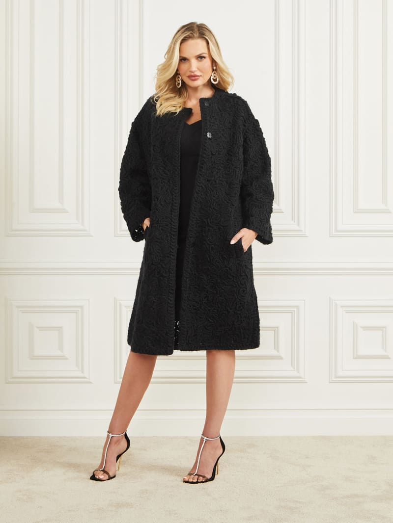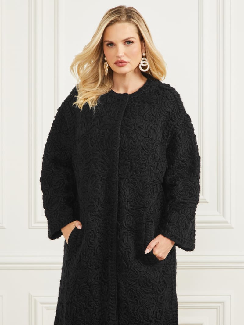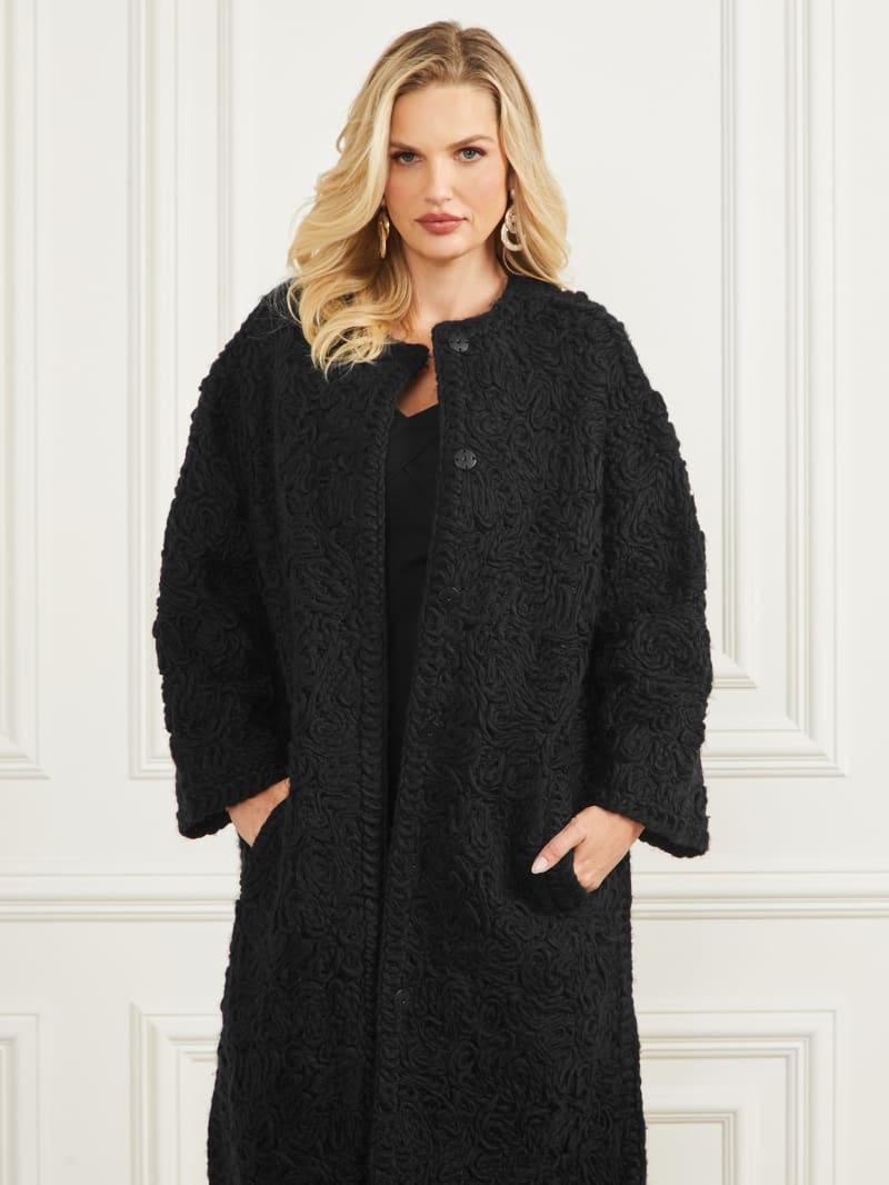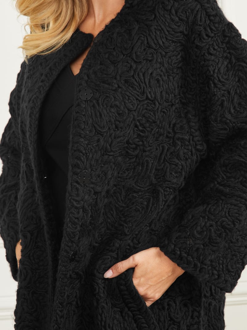 An intricate piece that adds delicate texture to your wardrobe, this wool-blend coat features a twisted yarn construction with a collarless design, invisible snap-button closures and side slip pockets.
