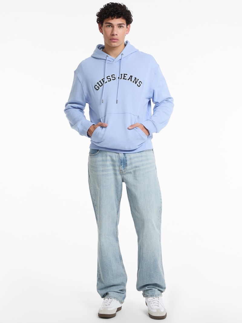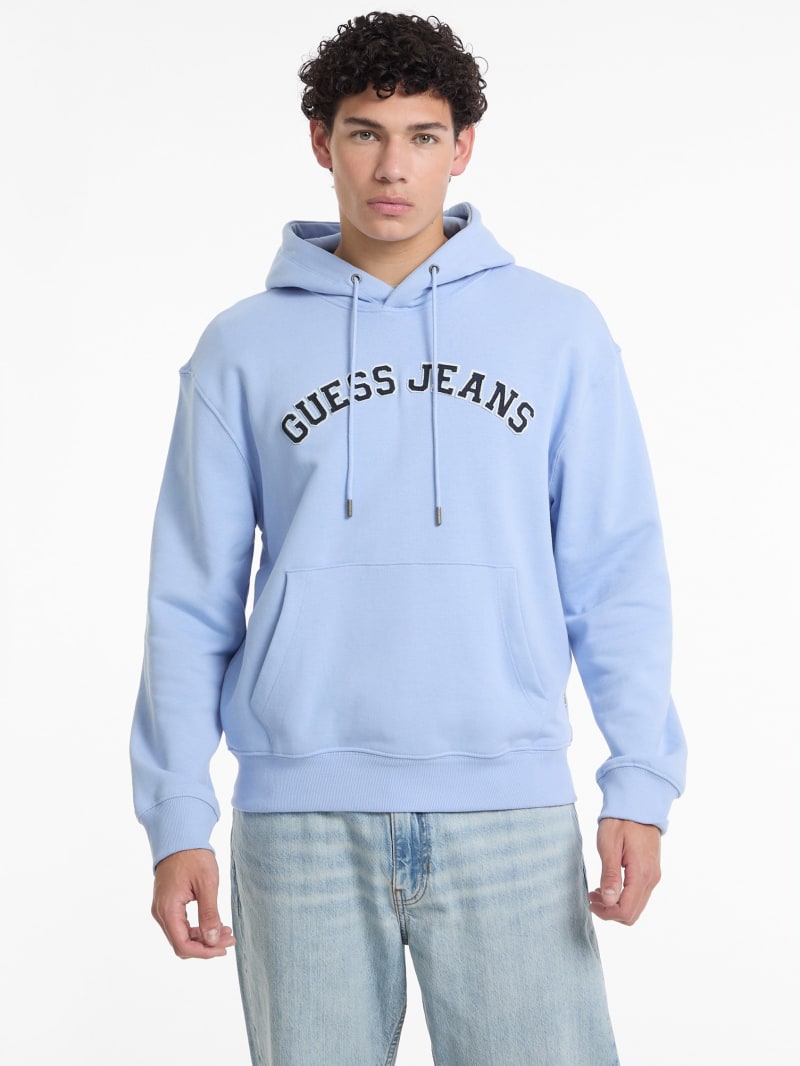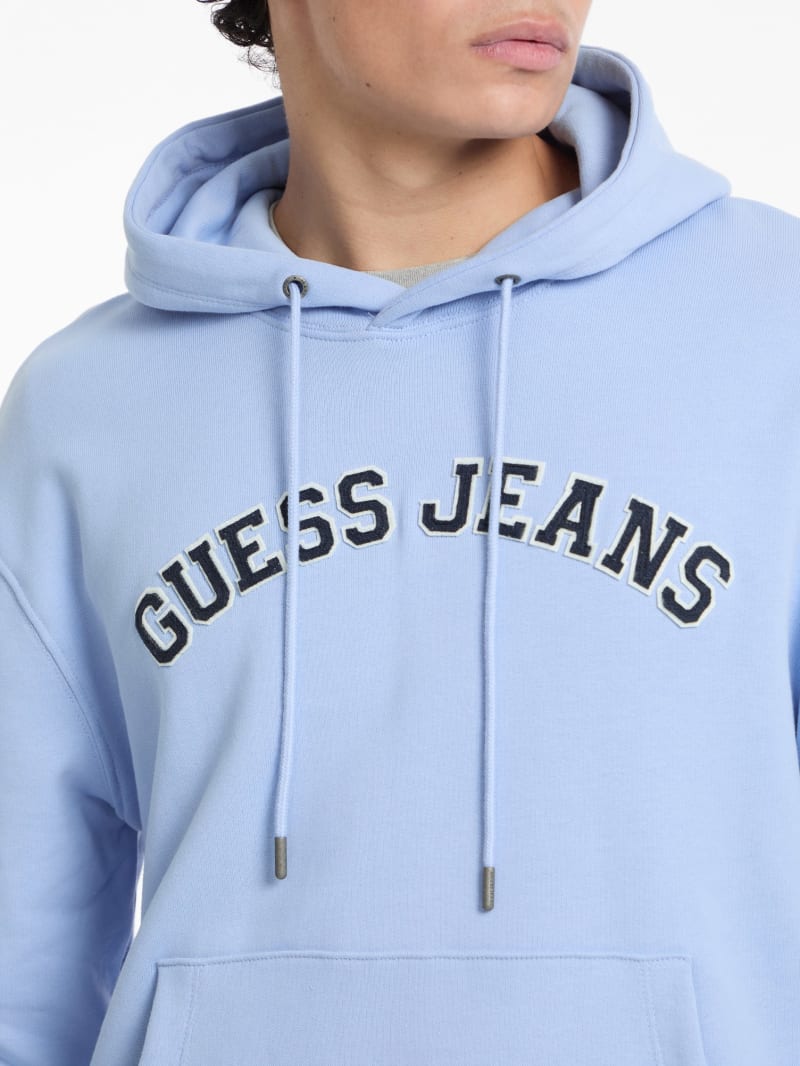 A classic, pullover hoody, featuring GUESS JEANS insignia across the chest and designed for everyday wear. Made with 100% cotton.