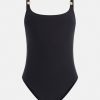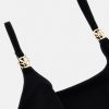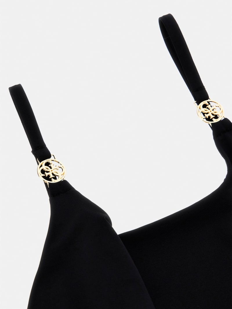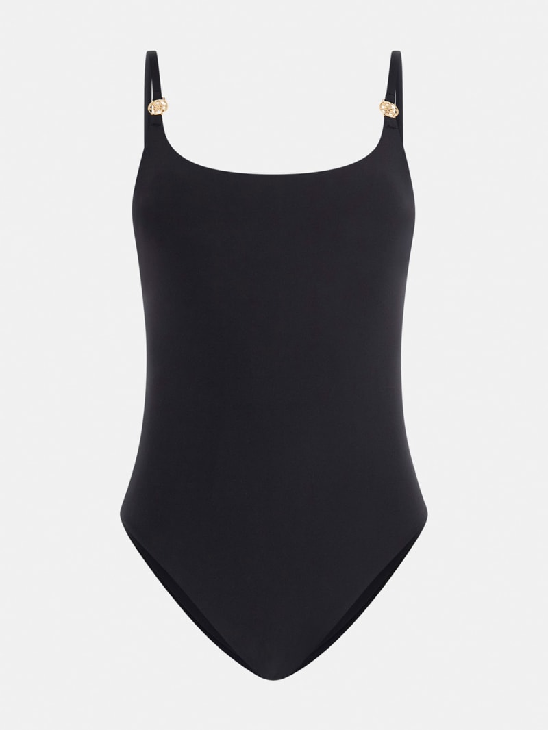 This one-piece swimsuit features a scoop neckline, open back, and adjustable straps with Quattro G charm details. Finished with an embellished chain-link belt for a statement touch, all in recycled microfiber.