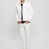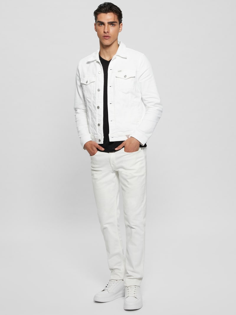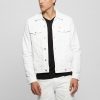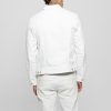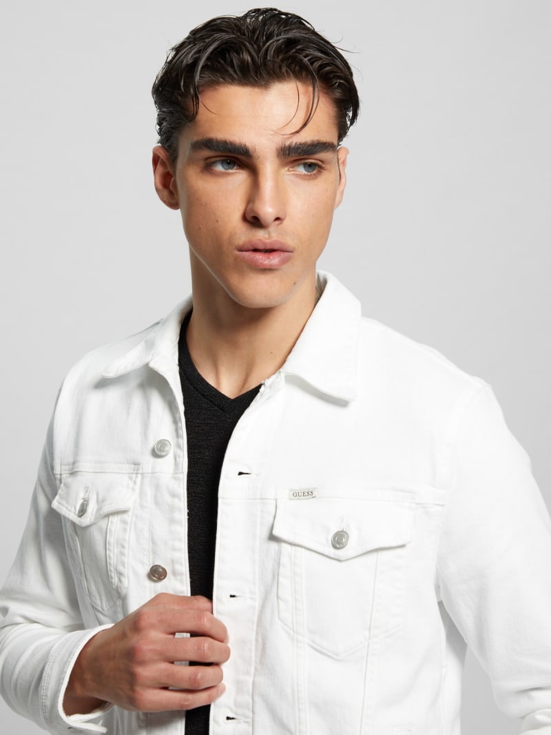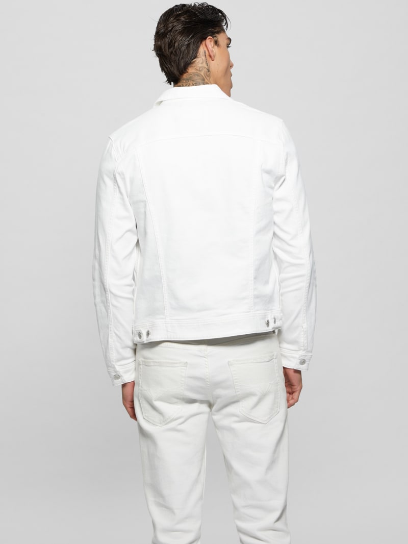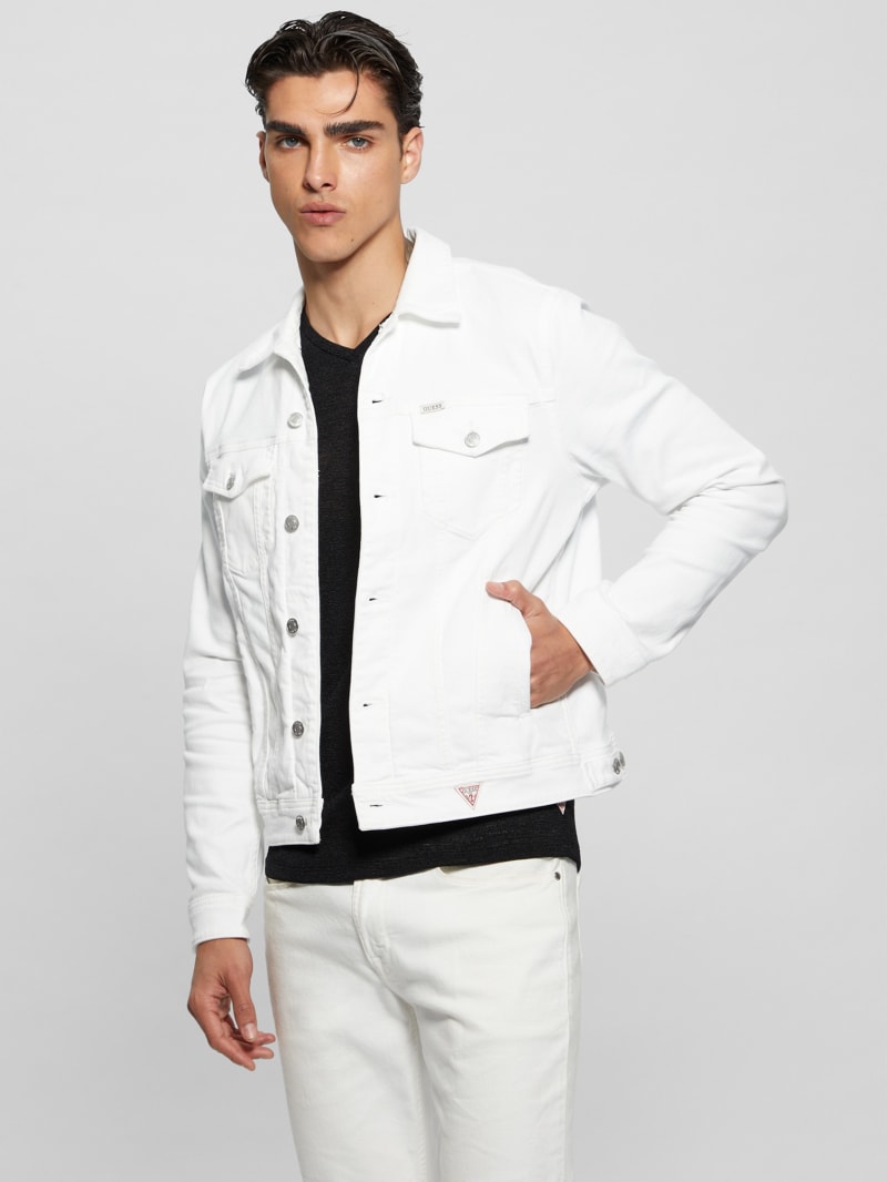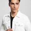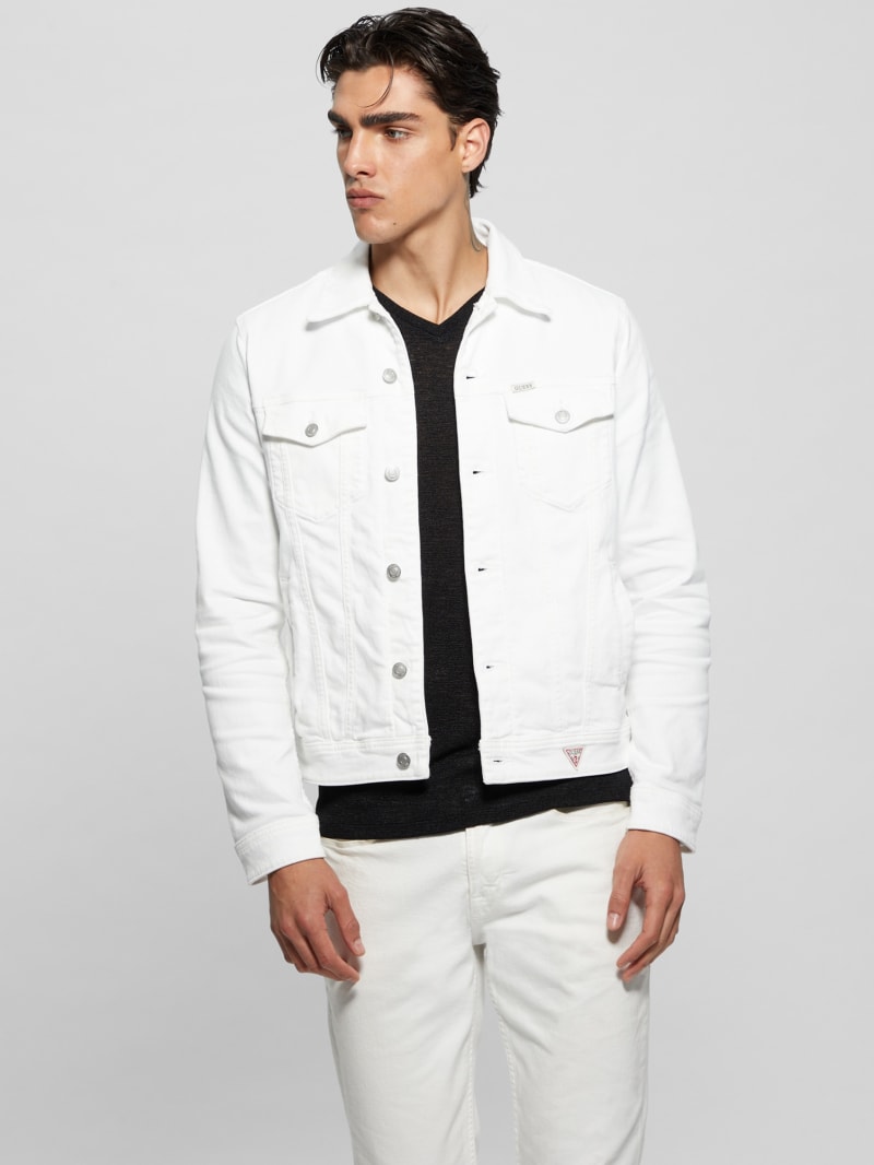 Streamline your style with this denim jacket featuring a folded collar, long sleeves, front pockets and a button-down closure. Contains organic cotton fiber.