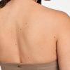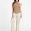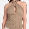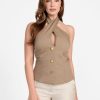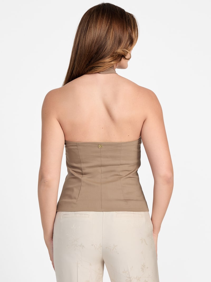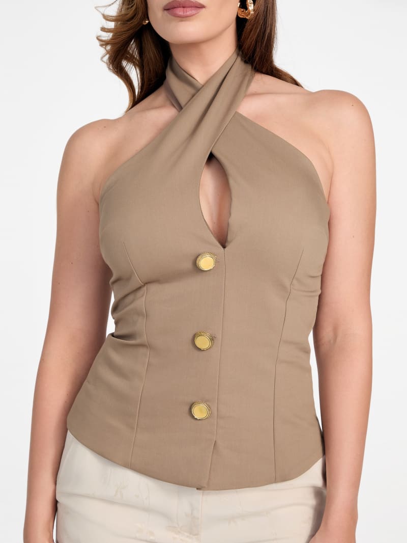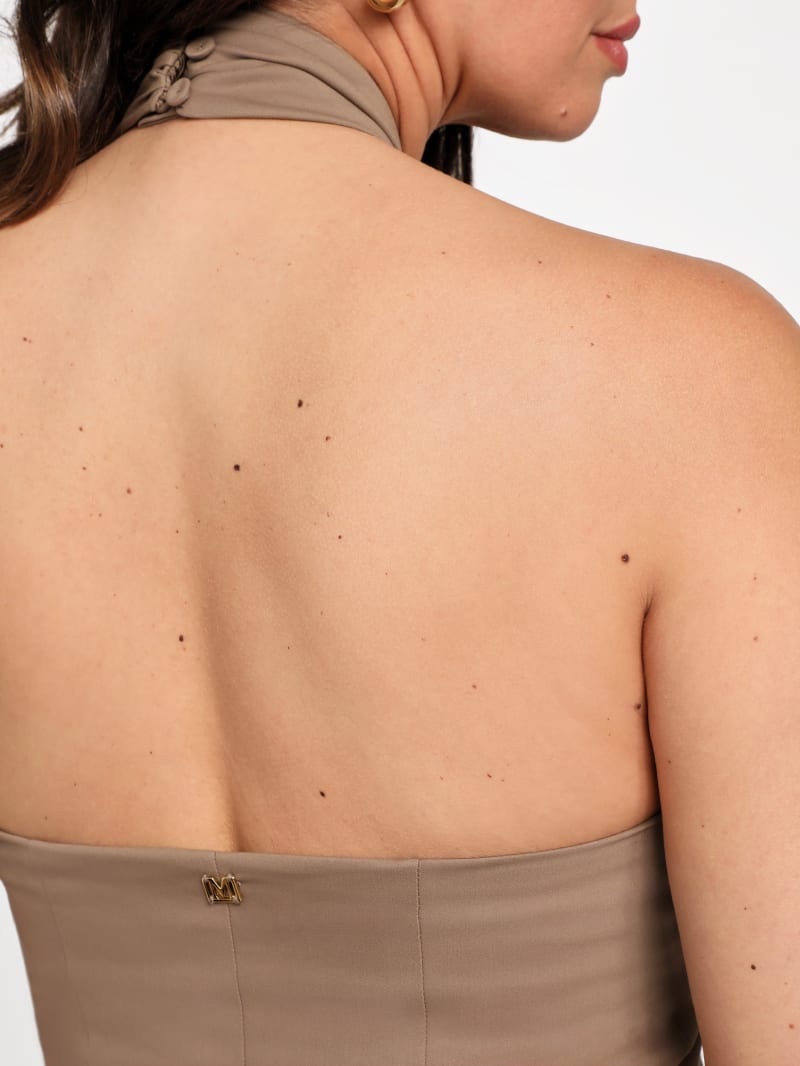- Halter neckline with crossed straps and keyhole front. Open back.