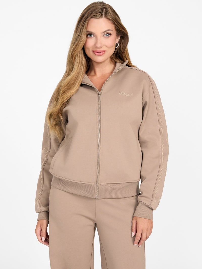- Rhinestone logo accents at front and down sleeves