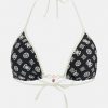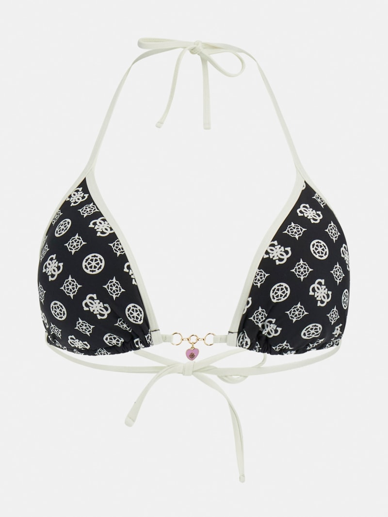 This bikini top features Quattro G printed knit jersey, triangle cups with removable padding, and a center-front charm. Finished with contrast trim and self-tie strings for a customizable fit.