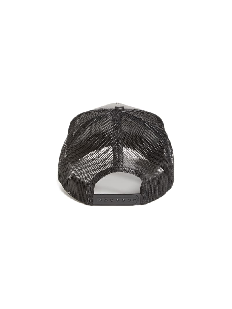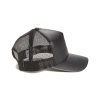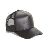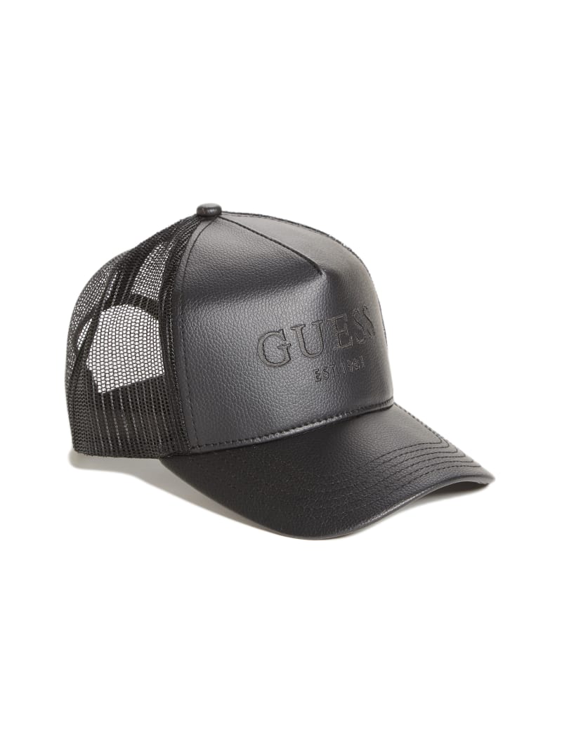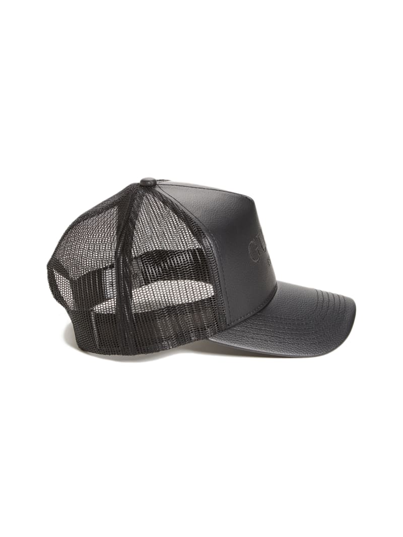 Trucker hat featuring a faux-leather brim and front panel with debossed logo detail.