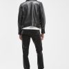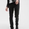 - Mid rise, sits high at hips. Slim fit and tapered leg.
