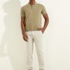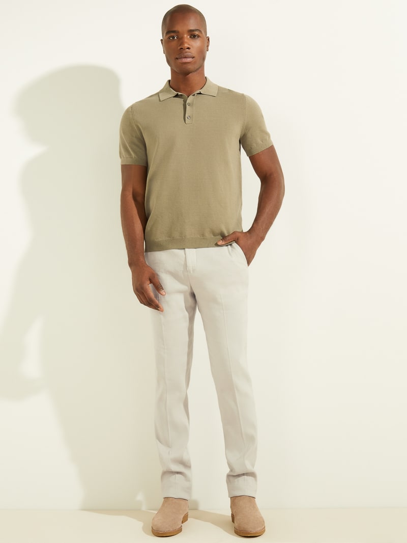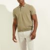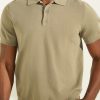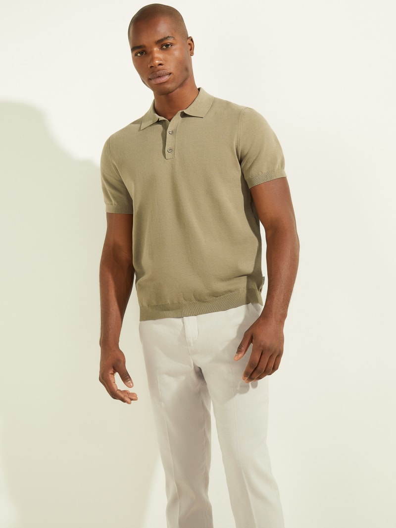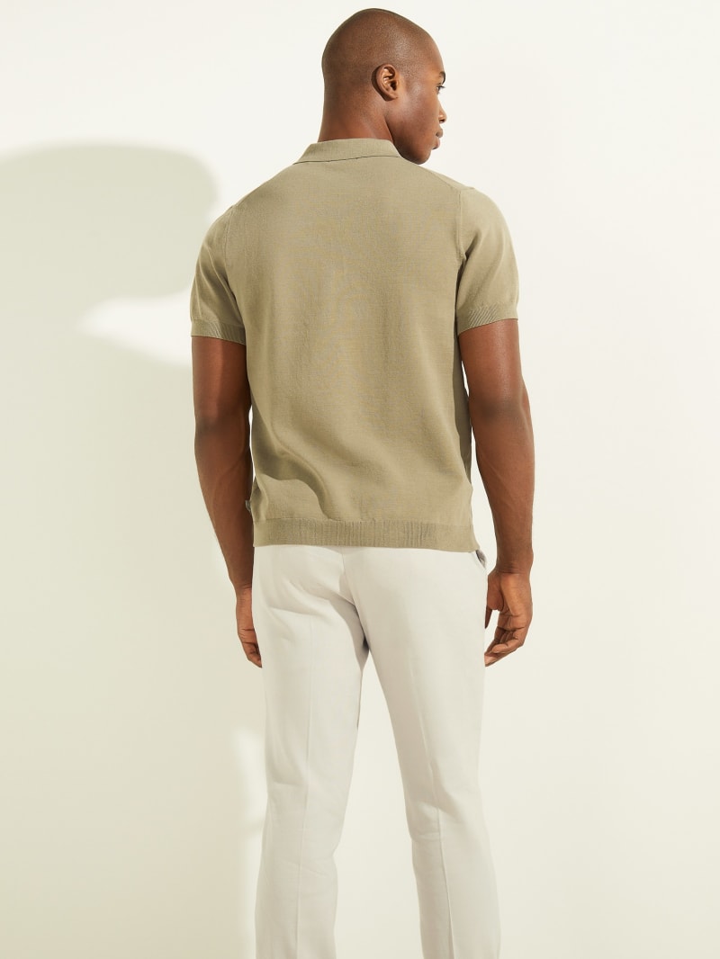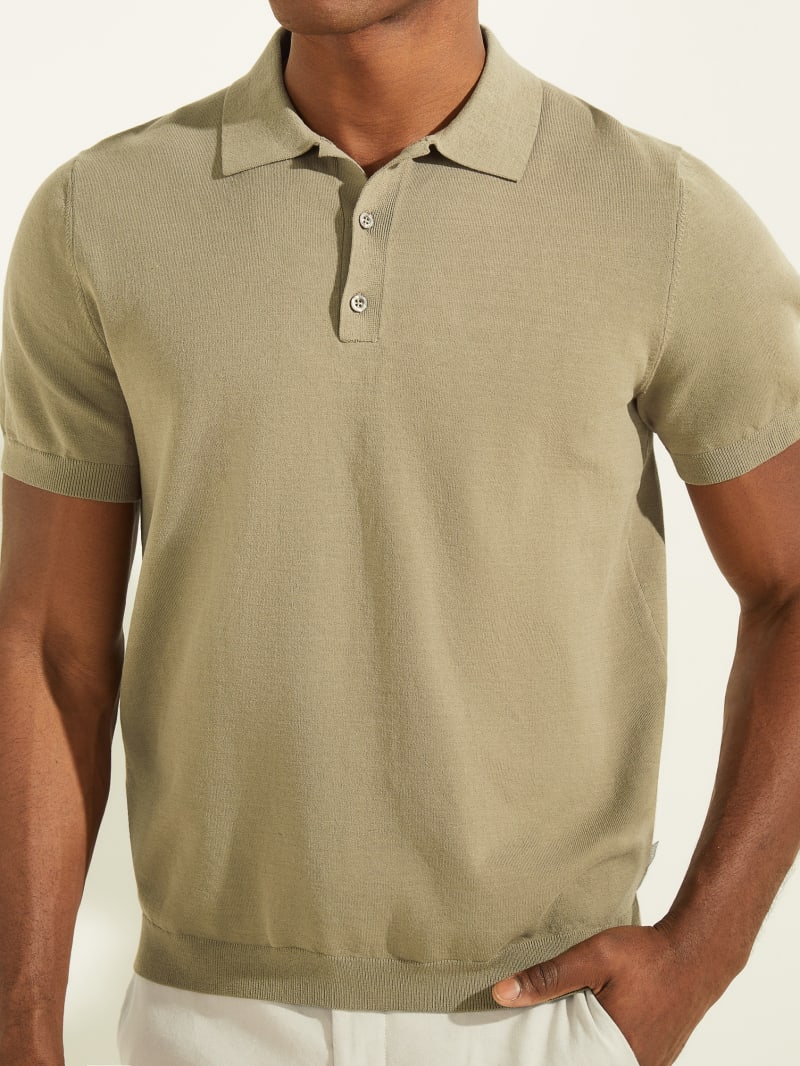 Fine-knit polo designed with a folded collar and quarter-length button placket. Features ribbed trim on the short sleeves.