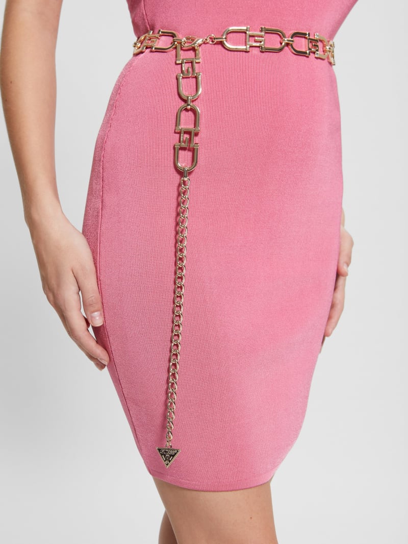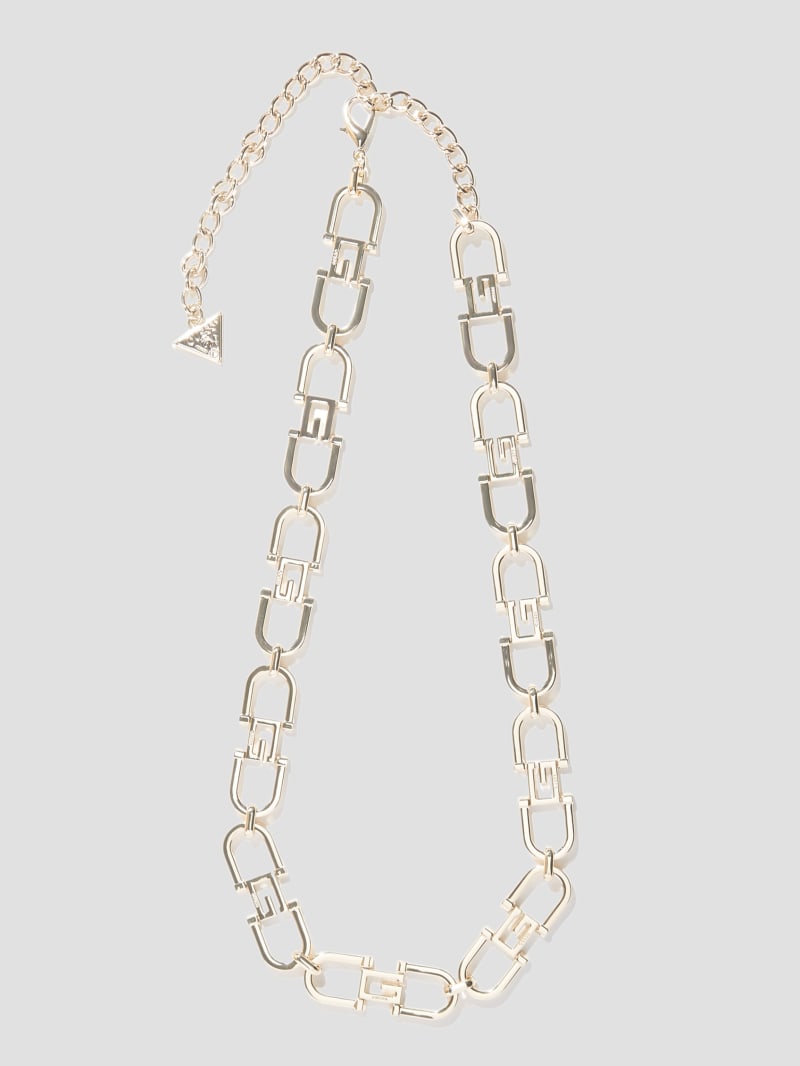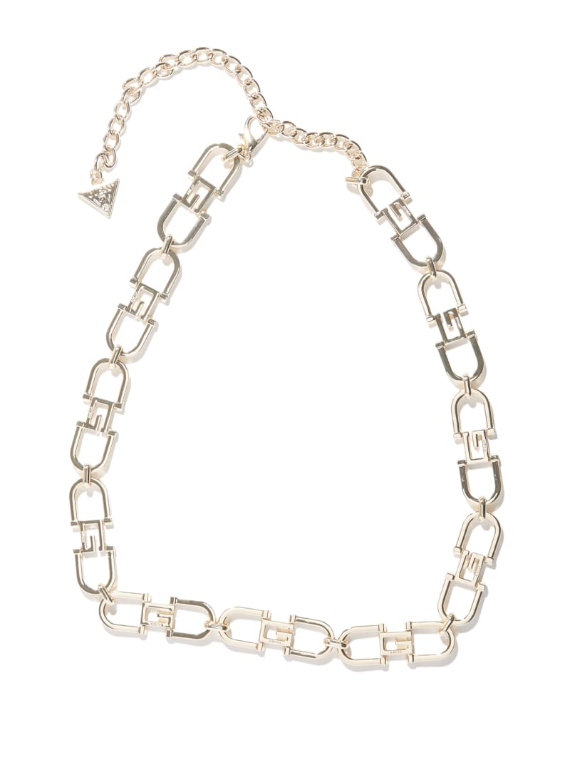 - A high-polish chain-link belt featuring D-ring links and square G logo links, as well as a lobster clasp.