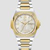 - Round crystal-encrusted gold-tone bezel with screw details