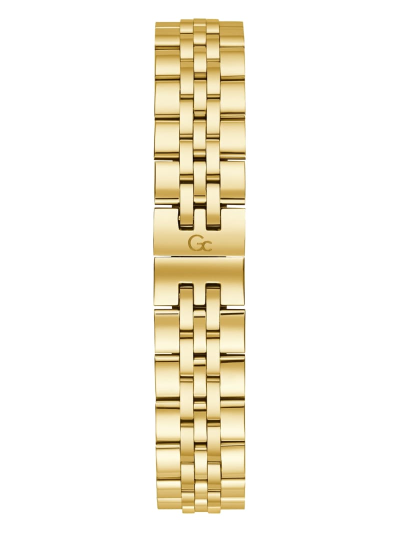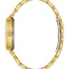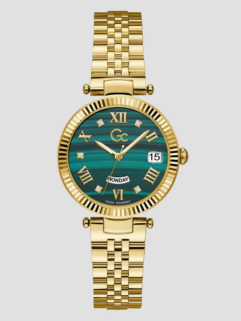 Highlight you style with this stunning gold-tone analog timepiece featuring a textured bezel encasing a beautiful water color-inspired green dial with mixed Roman numeral and genuine diamond hour markers. Day and date function.