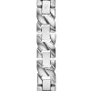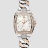 - Silver-tone barrel case with crystal embellished lug connections