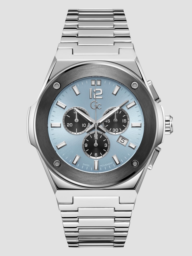 - Dark gray accent multifunctional day, date, and 24-hour international time subdials