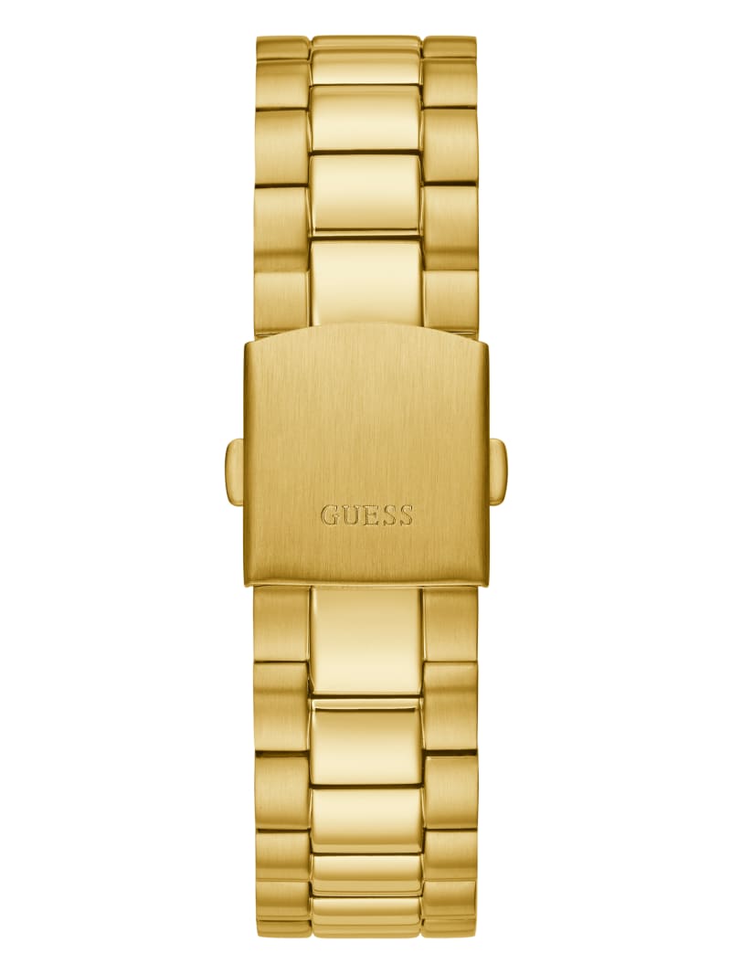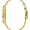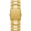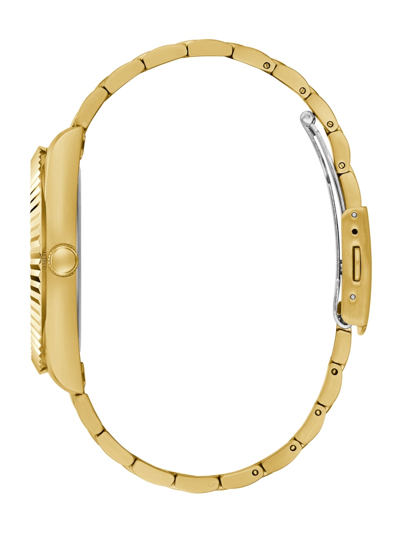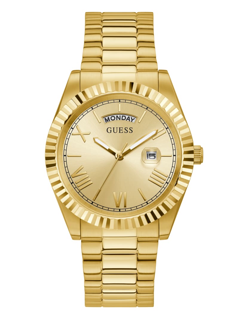 Keep your look sleek with this polished gold-tone watch featuring a textured bezel surrounding an analog dial with day and date functions. Completed by a link bracelet.