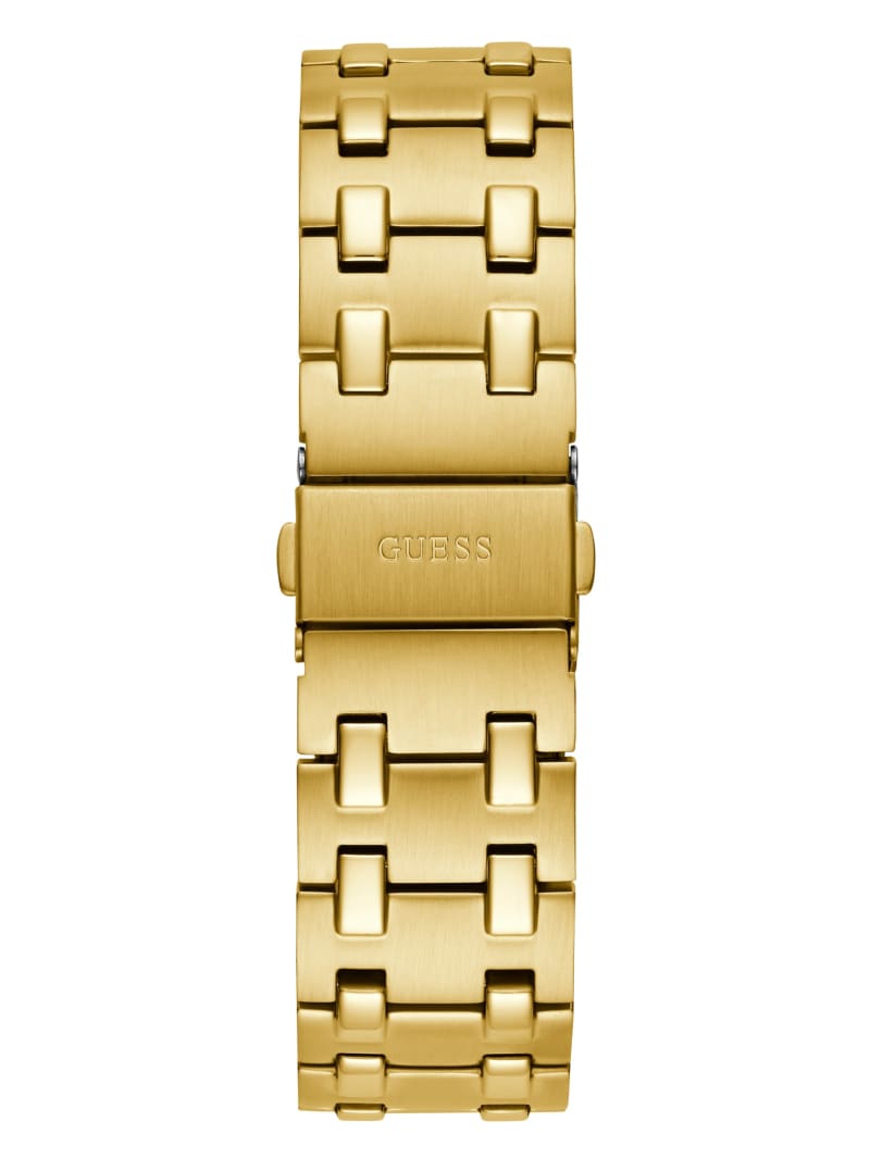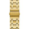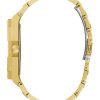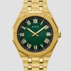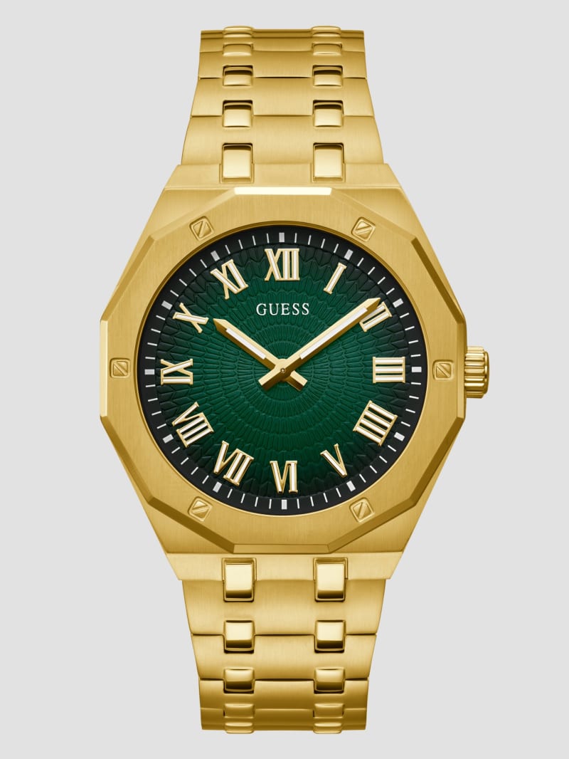 Refine your look with this gold-tone timepiece designed with a studded dodecagonal bezel and textured sunburst pattern on the green analog dial. Finished by Roman numeral hour markers and classic link bracelet.