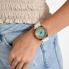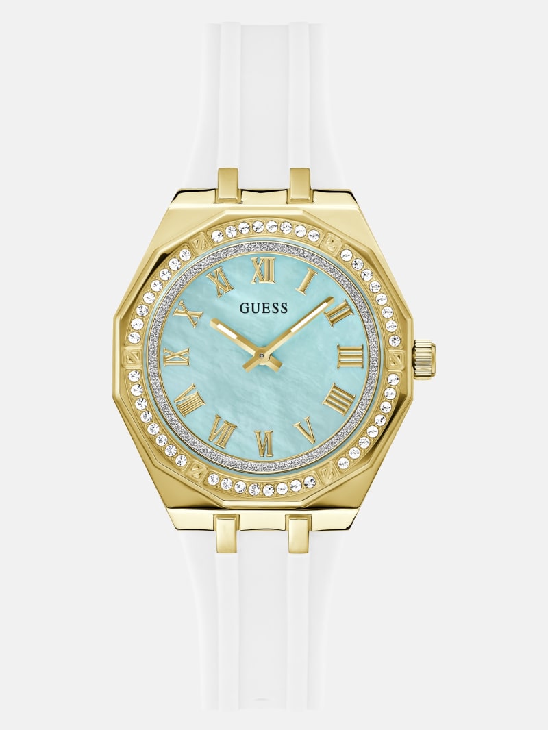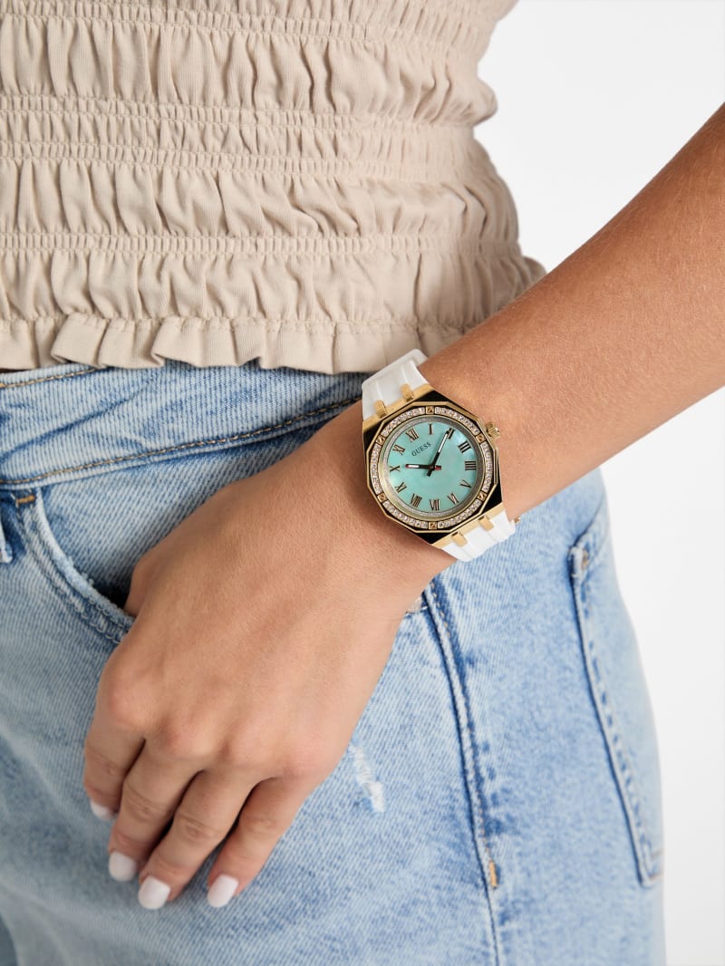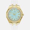 - Gold-tone polished dodecagonal bezel encrusted with crystals