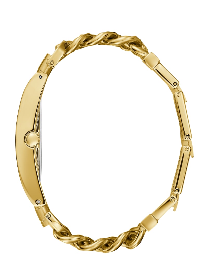 A standout option, this gold-tone analog watch features a layered chainlink bracelet, crystal embellishments and a logo detail. Matching silver-tone case.