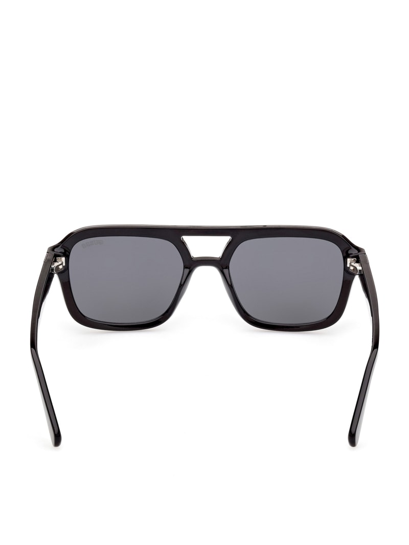 For sol searching. Aviator sunglasses feature plastic frames, a brow bar, tinted lenses and a square rhinestone design with a logo at the temples.