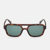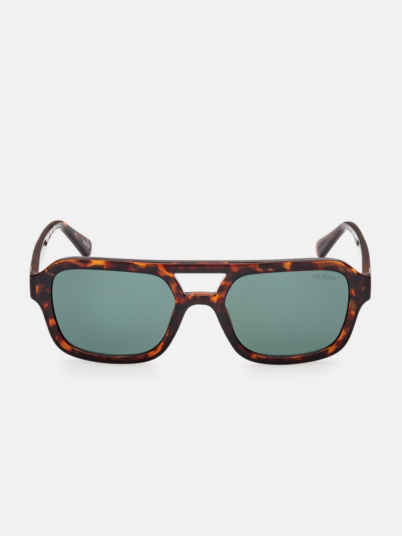 For sol searching. Aviator sunglasses feature plastic frames, a brow bar, tinted lenses and a square rhinestone design with a logo at the temples.