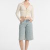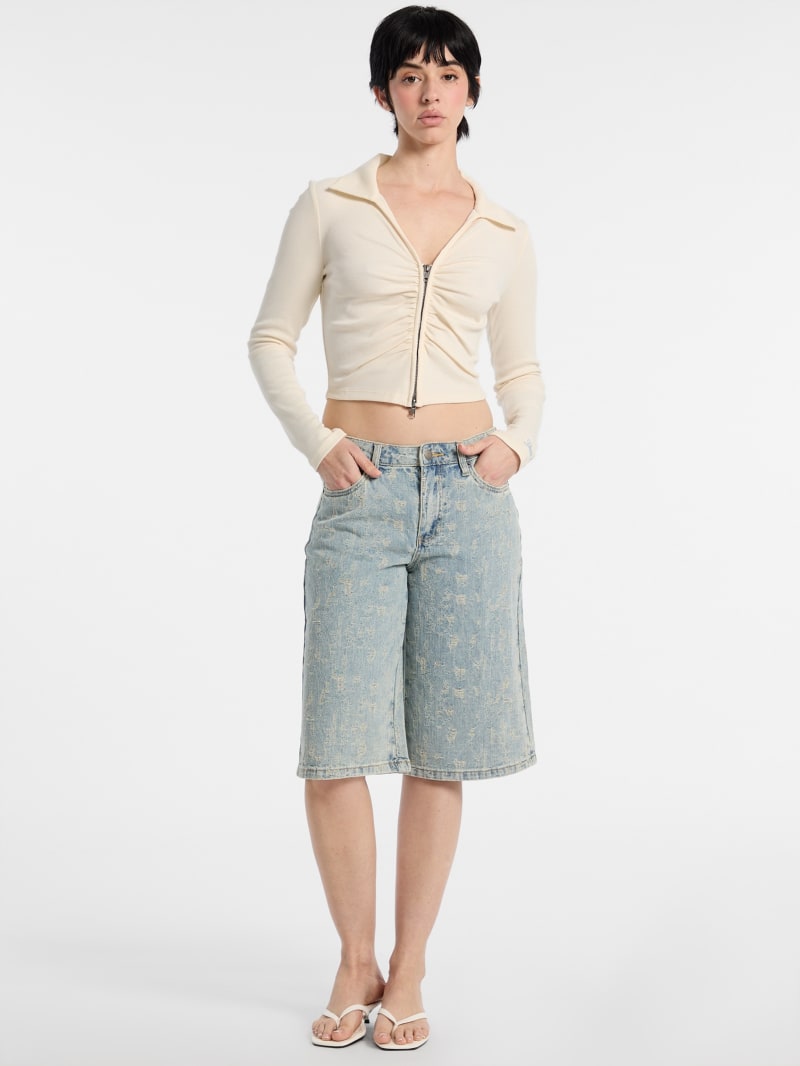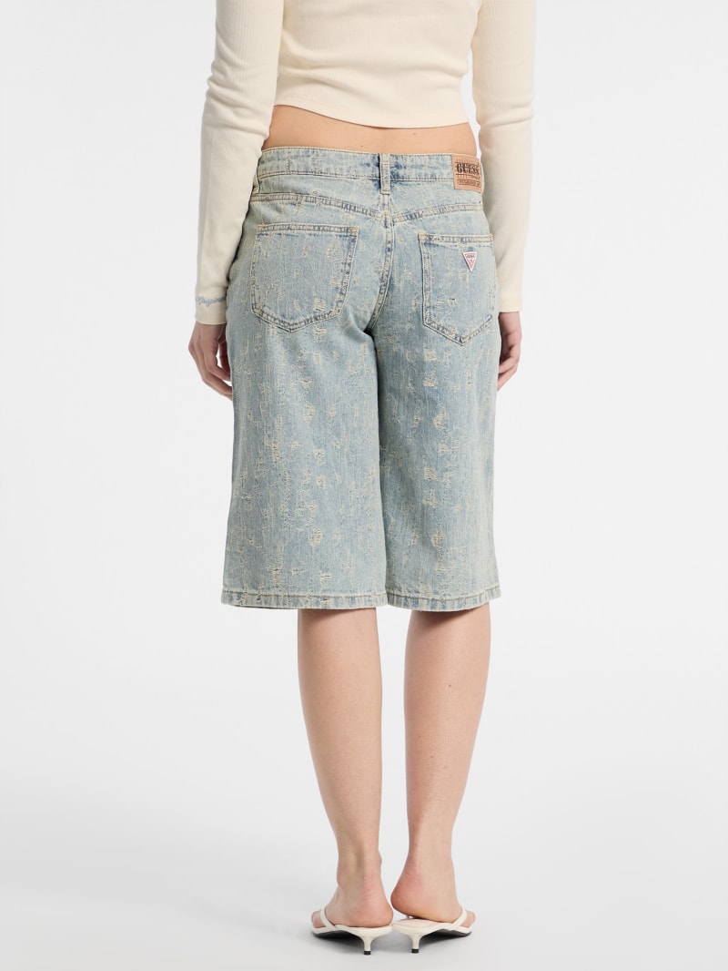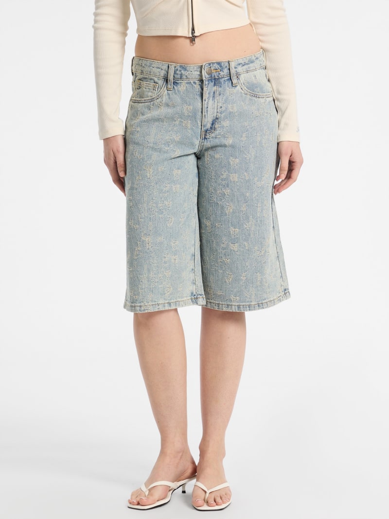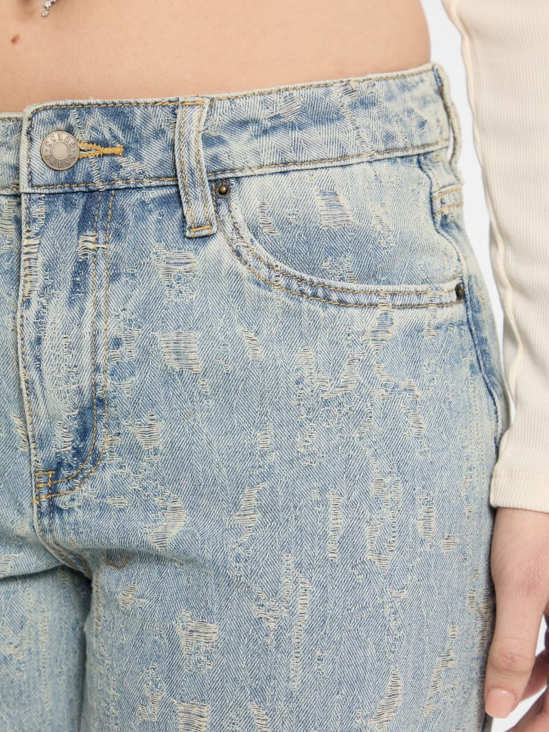 - Light-wash indigo denim with allover distressing. Each garment has its own unique appearance.
