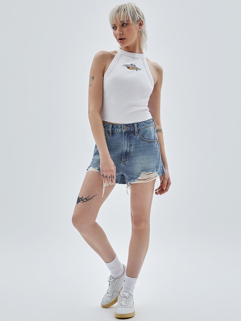 These medium-wash denim shorts feature destroyed details and frayed trim at the hem, a five-pocket design and zip-fly closure. The GUESS Originals Kit Program offers versatile and elevated essentials meant to be worn year-round. Each silhouette included in the program emphasizes long-lasting premium denim and vintage-inspired styles that provide nostalgia from the brand’s lexicon of design.