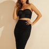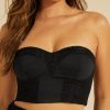 Show off in this bustier-style strapless top featuring a cropped lace body with solid paneling at front. Exposed back zip closure.