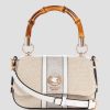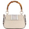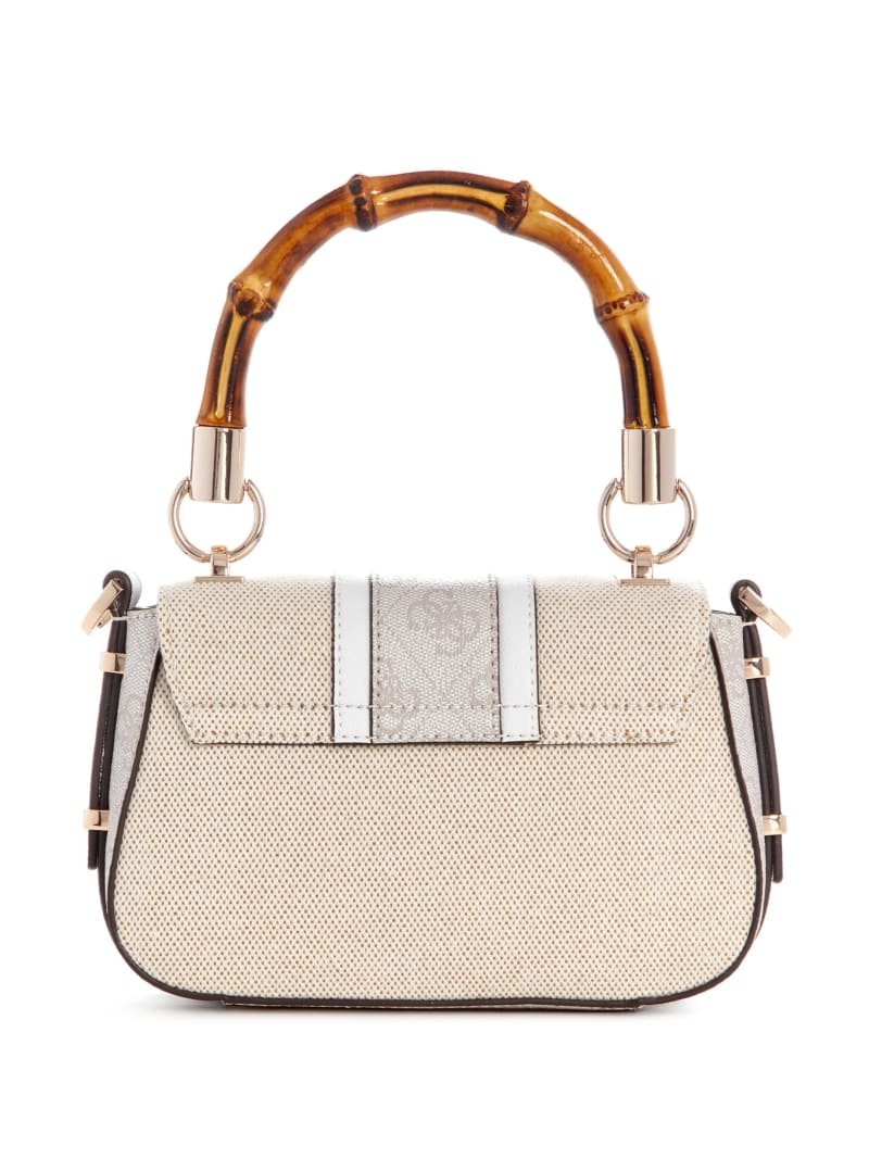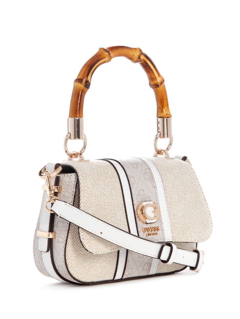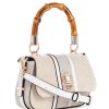 - Bamboo-inspired handle with 4" drop. Detachable crossbody strap with 23" drop.