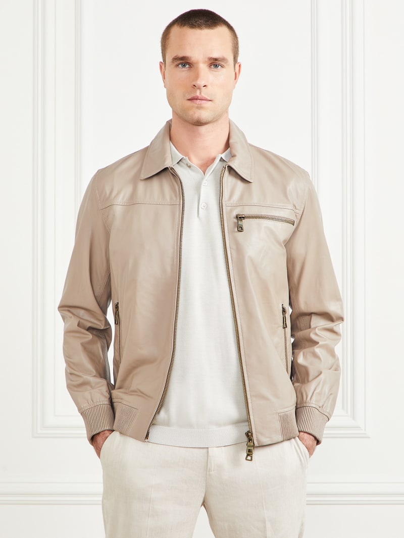 A refined staple for the modern man, this flight jacket is designed in a smooth genuine leather with a folded collar and ribbed cuffs and bottom hem. Completed by a chest zip pocket and front zip closure.