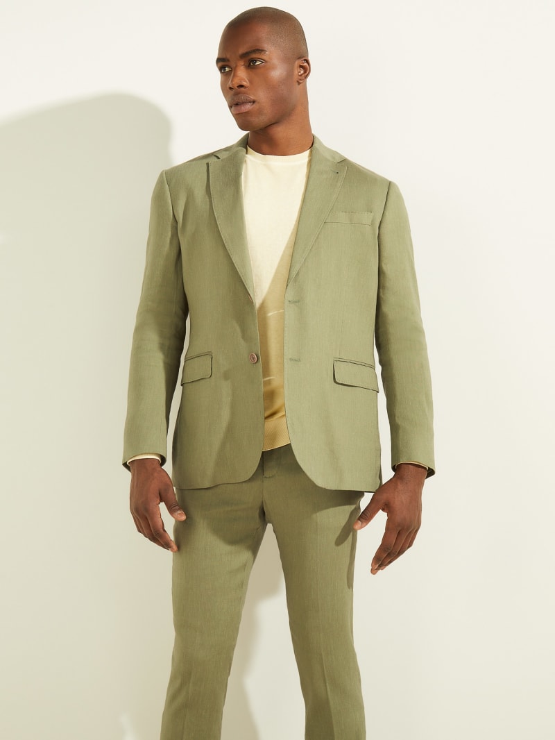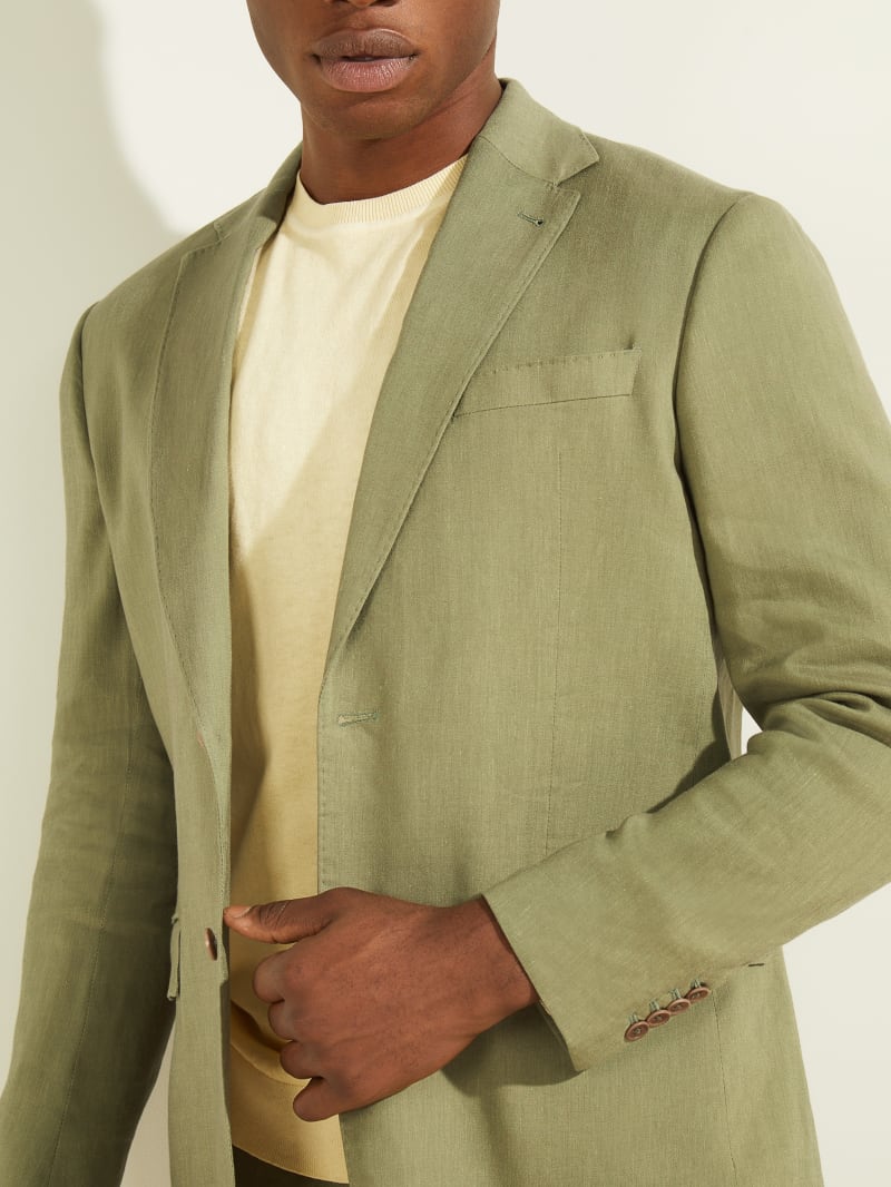Ideal for warm-weather occasions, this lightweight linen-blend blazer features a notched collar, dual front button closures and rounded bottom hems. Completed by four interior pockets and a silky lining.