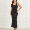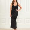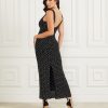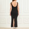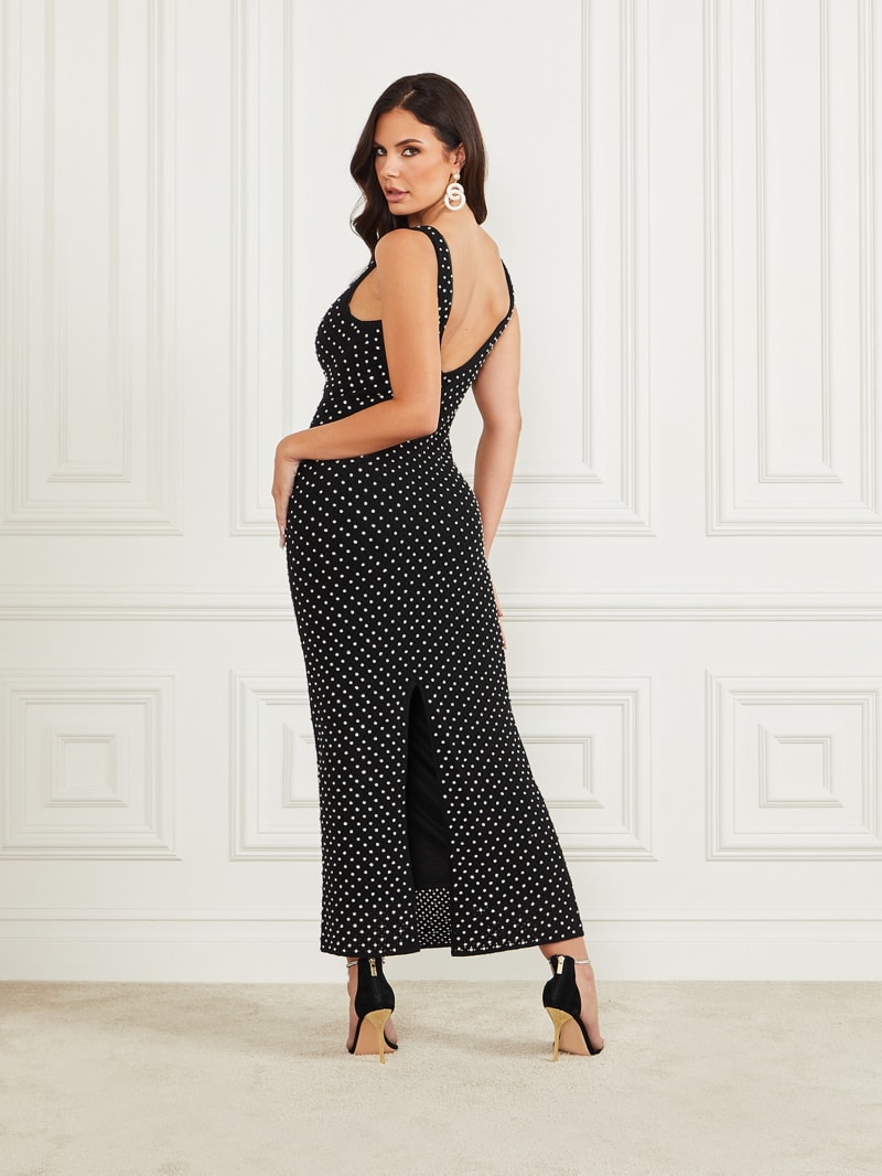 Get lost in a moment of wonder this evening in this curve-embracing knit gown that features dynamic crystal embellishments as mesmerizing as a sky full of stars, as well as an alluring back slit that is tango-ready.