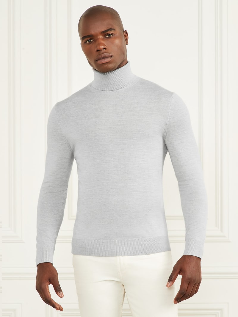 Stay classy in luxurious warmth with this timeless turtleneck sweater. Featuring long sleeves, a ribbed turtleneck collar and cuffs. Made with wool fibers.