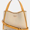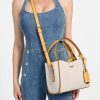 - Top handles with logo charm 6.5" drop. Detachable crossbody strap with 22" drop.