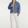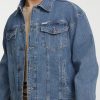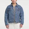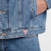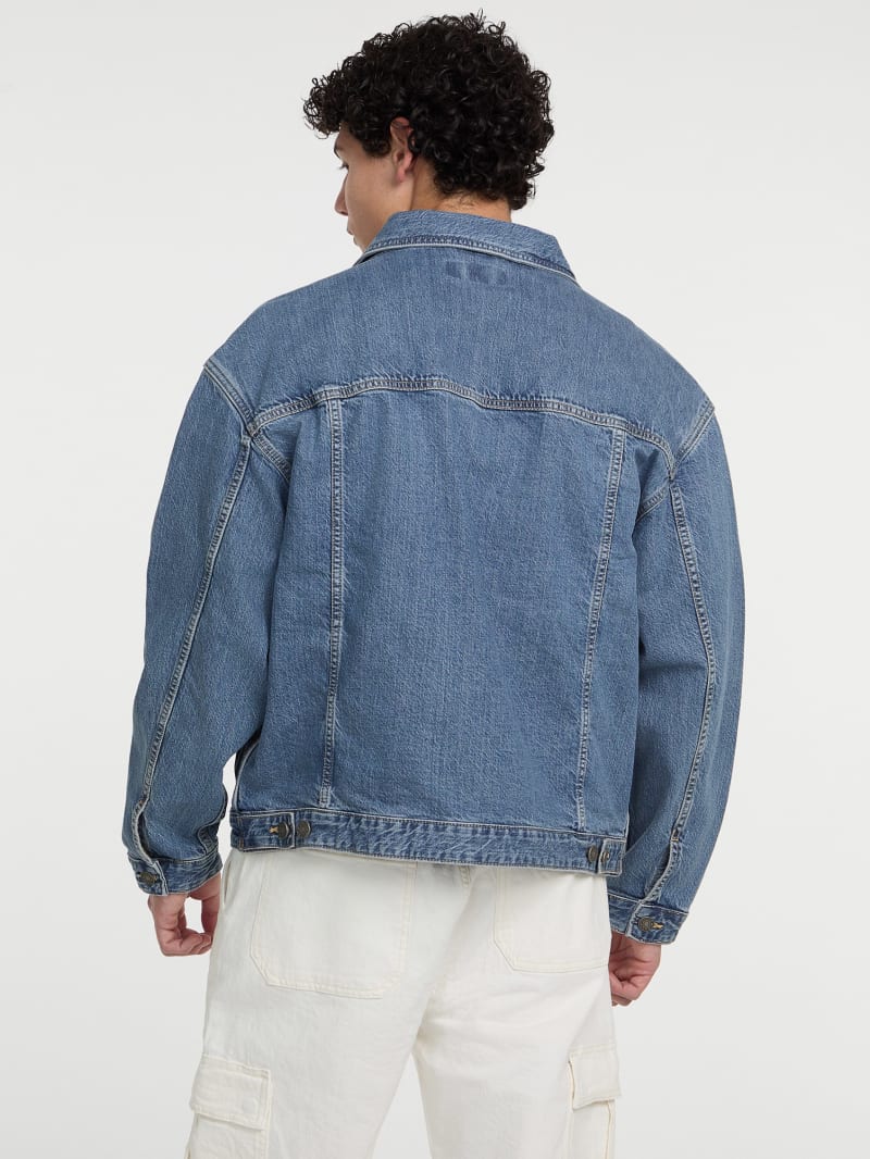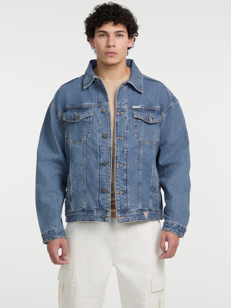 An oversized button up denim trucker jacket. Details include dual chest pockets and a folded collar. Made with our signature GUESS JEANS denim featuring GUESS AIRWASH™.