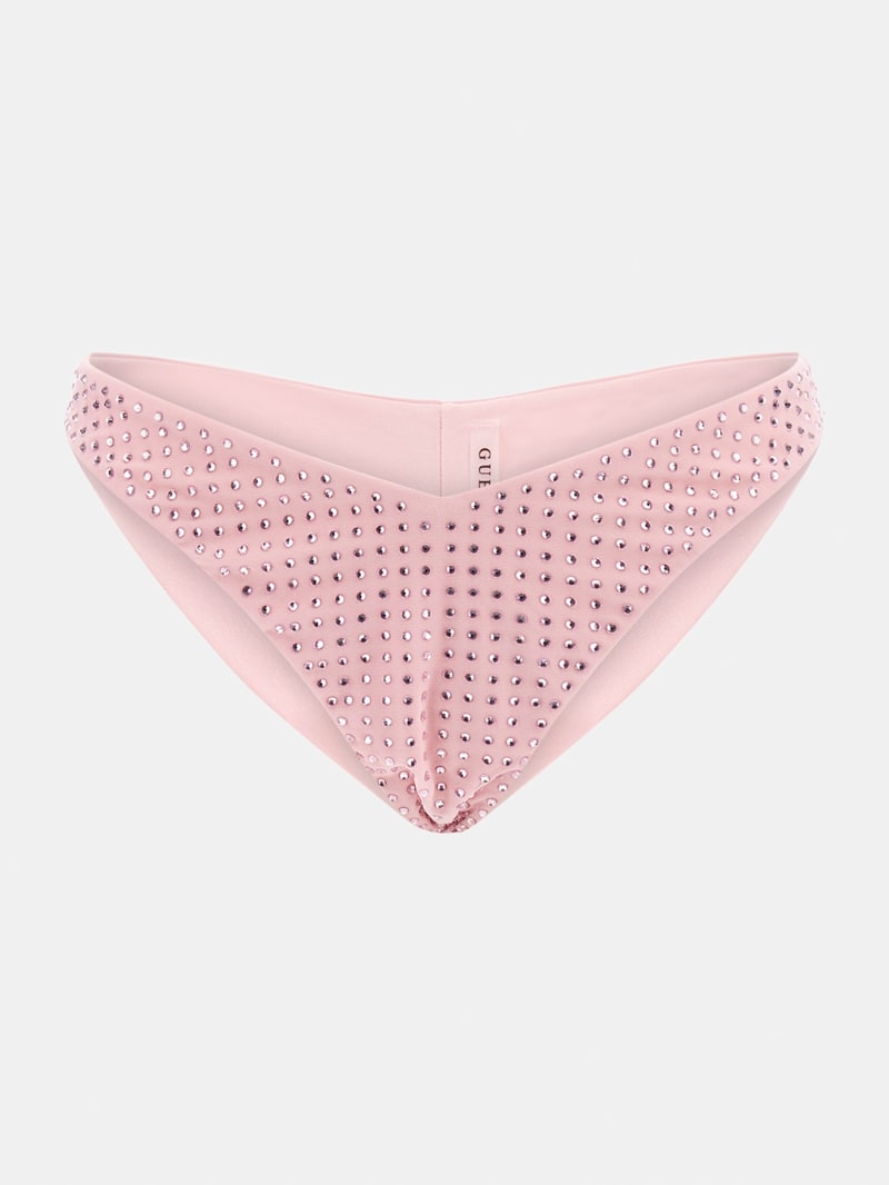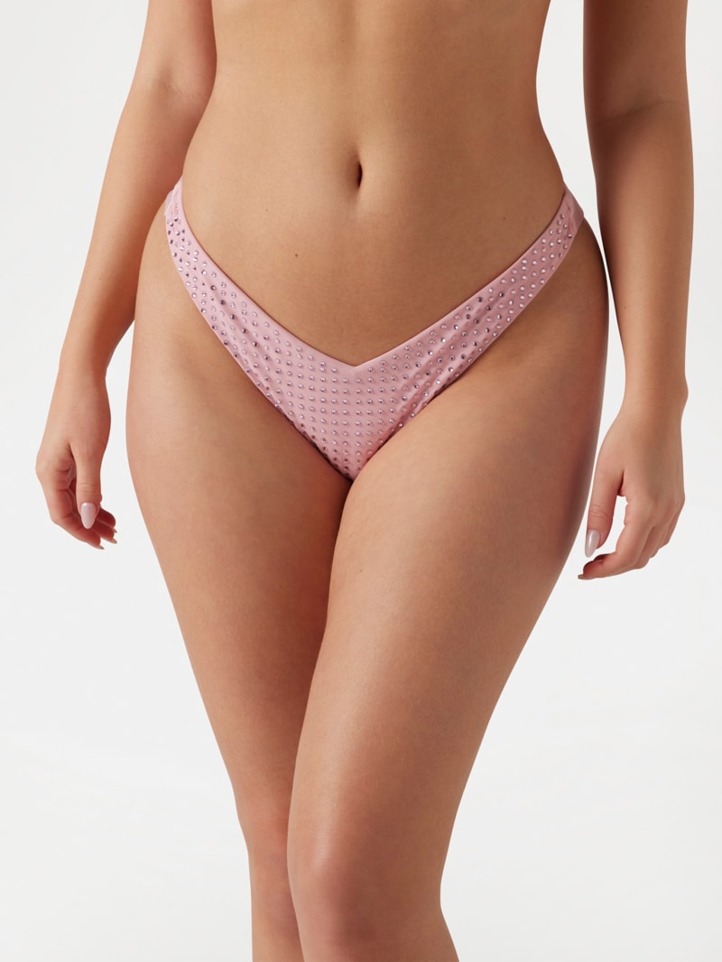 Shine brighter than the sun in this Brazilian bikini bottoms. Encrusted with front rhinestones and a signature triangle on the back.