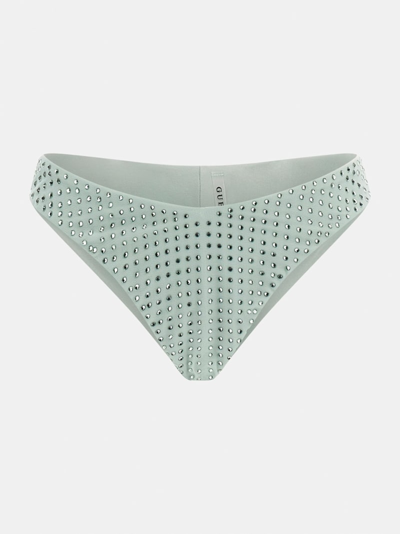 Shine brighter than the sun in this Brazilian bikini bottoms. Encrusted with front rhinestones and a signature triangle on the back.