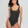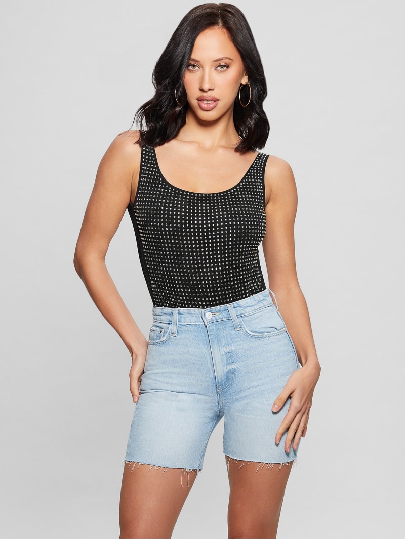 Dazzle and delight in this embellished one-piece swimsuit, complete with rhinestones and a daring open back.