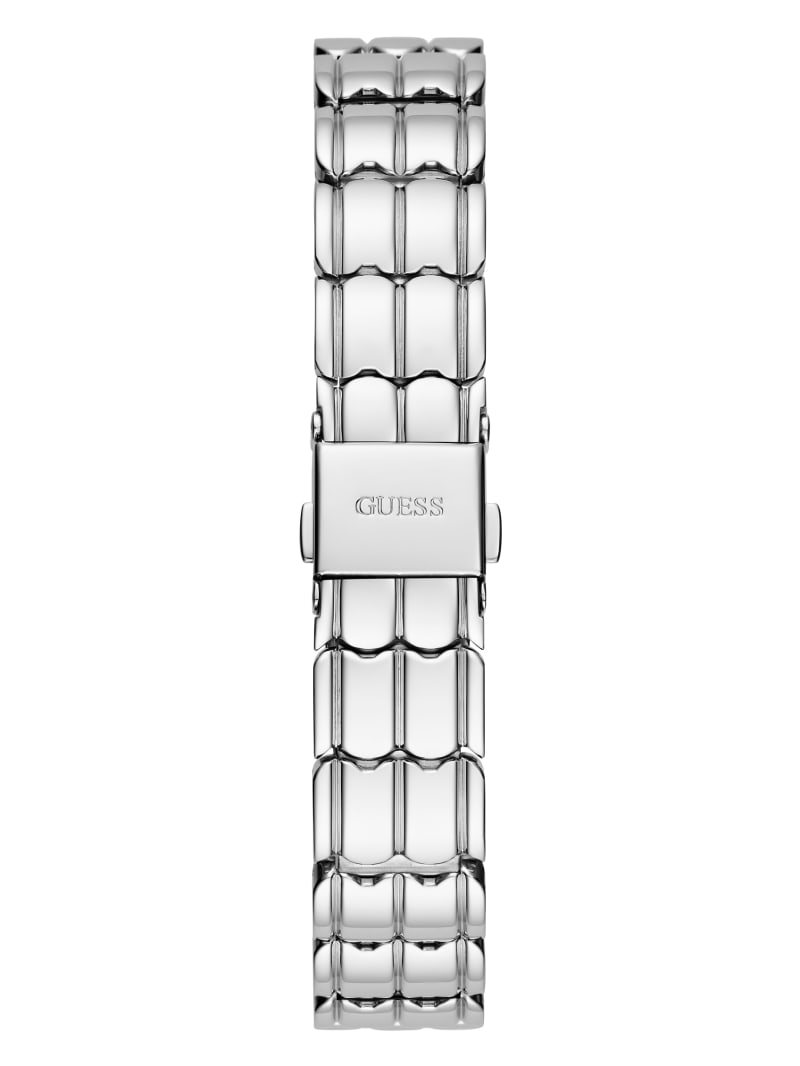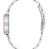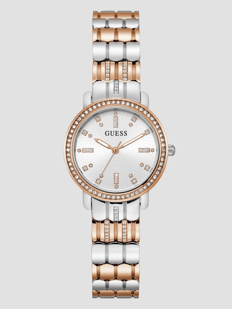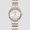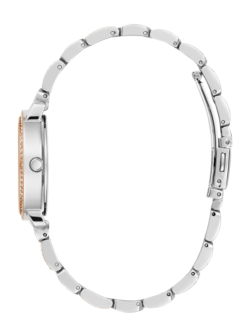 - Polished two-tone stainless steel link bracelet with crystal details at the lug connections