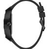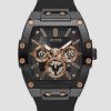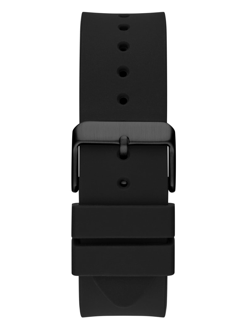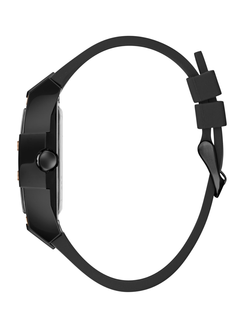 Designed in a versatile black motif, this modern timepiece features a studded case and rose gold-tone hour markers and sub-dials. Finished by a silicone strap.
