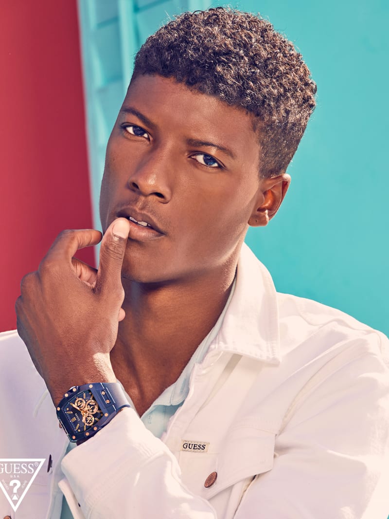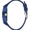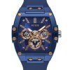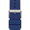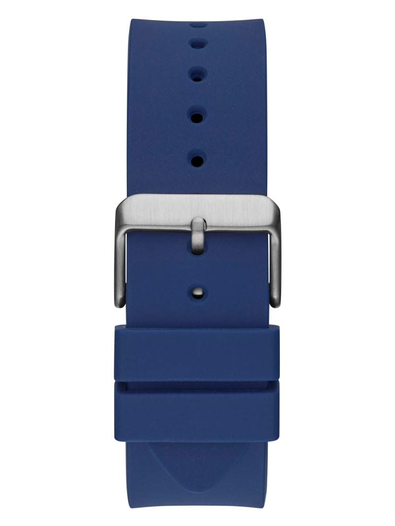 Designed in a deep blue motif, this modern timepiece features a studded case and rose gold-tone hour markers and sub-dials. Finished by a silicone strap.