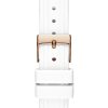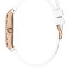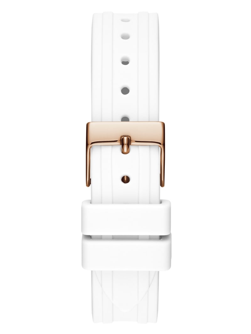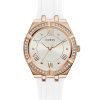 The perfect polished touch for any outfit, this rose gold-tone analog watch features a white sunray dial with a crystal-encrusted bezel, and a white silicone strap.