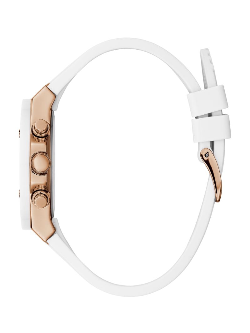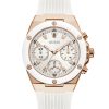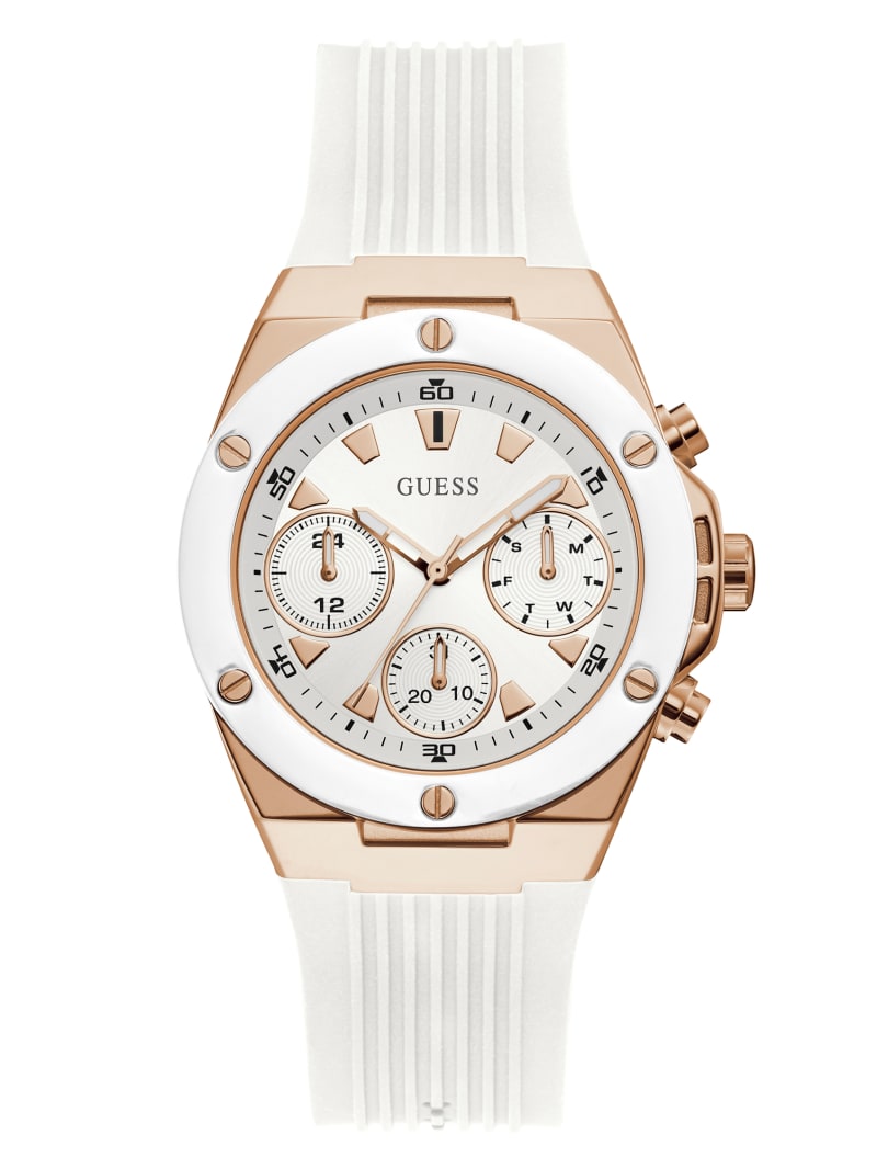 Upgrade your look with this stunning watch designed with a rose gold-tone case and white sunray multifunction dial. Complete with a textured white silicone strap.