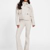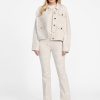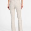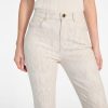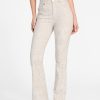 - Mid-rise, sits at natural waist. Flared leg.