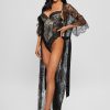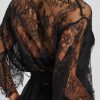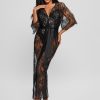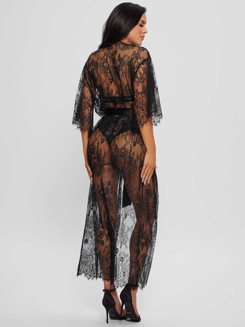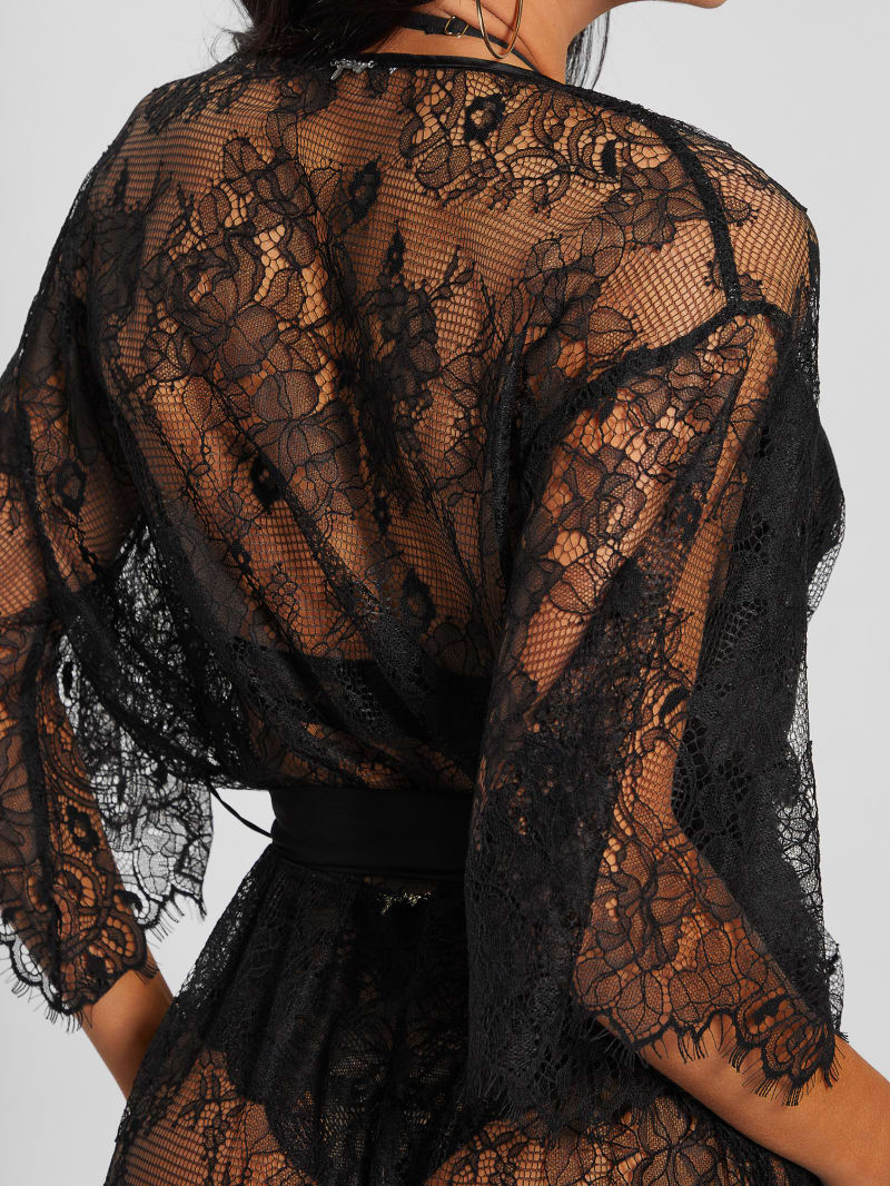 Sweep them off their feet in this decorated longline kimono featuring embroidered lace and a satin belt.