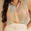Styled in a lightweight fabrication with allover print, this sleeveless blouse features a folded collar and gold-tone front button closures.
