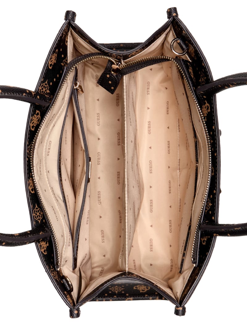 - Top handles with detachable charm. Adjustable crossbody strap.