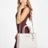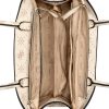 - Top handles with detachable charm. Adjustable crossbody strap.